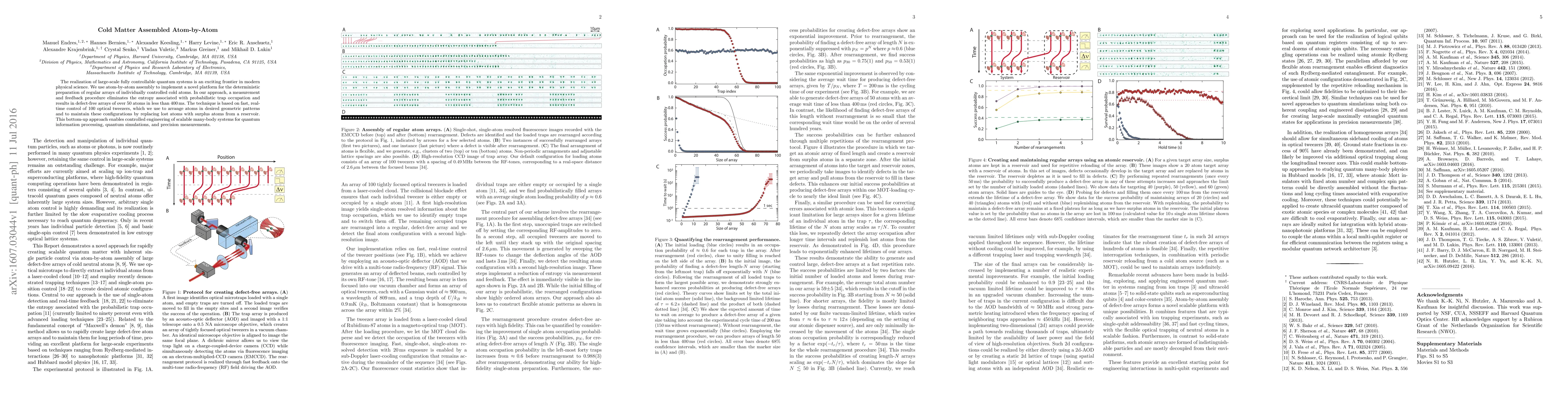 This paper presents a method for creating large-scale, fully controllable quantum systems using atom-by-atom assembly, achieving defect-free arrays of over 50 atoms in under 400 ms through a measurement and feedback procedure. The technique employs 100 optical tweezers for precise arrangement and real-time control, enabling scalable many-body systems for quantum information processing and simulations.