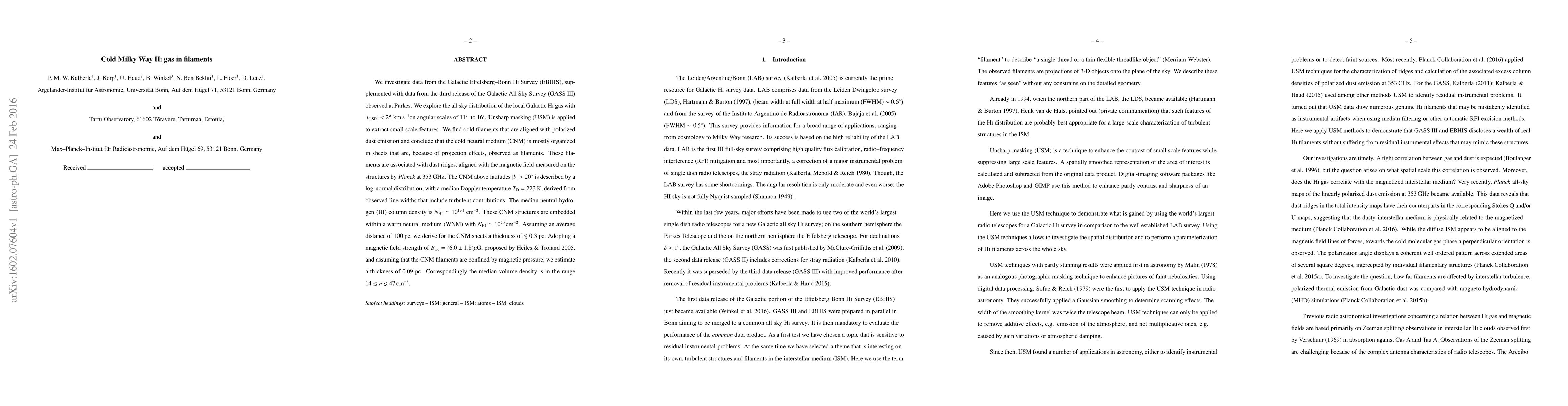 This paper analyzes HI gas data to reveal cold neutral medium (CNM) filaments in the Milky Way, finding they align with polarized dust and magnetic fields. The CNM forms sheets observed as filaments, with a median temperature of 223 K and a thickness of less than 0.3 pc.