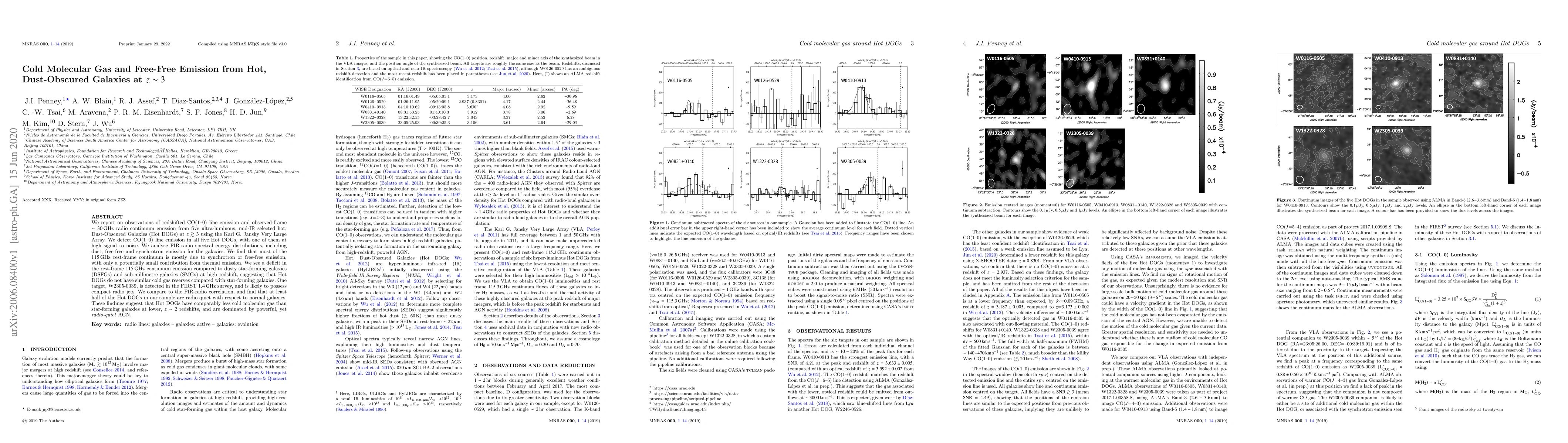 We report on observations of redshifted CO(1-0) line emission and observed-frame $\rm\sim$ 30GHz radio continuum emission from five ultra-luminous, mid-IR selected hot, Dust-Obscured Galaxies (Hot DOGs) at $z\rm\gtrsim$ 3 using the Karl G. Jansky Very Large Array. We detect CO(1-0) line emission in all five Hot DOGs, with one of them at high signal to noise. We analyse FIR-radio spectral energy distributions, including dust, free-free and synchrotron emission for the galaxies. We find that most of the 115 GHz rest-frame continuum is mostly due to synchrotron or free-free emission, with only a potentially small contribution from thermal emission. We see a deficit in the rest-frame 115 GHz continuum emission compared to dusty star-forming galaxies (DSFGs) and sub-millimetre galaxies (SMGs) at high redshift, suggesting that Hot DOGs do not have similar cold gas reserves compared with star-forming galaxies. One target, W2305-0039, is detected in the FIRST 1.4 GHz survey, and is likely to possess compact radio jets. We compare to the FIR-radio correlation, and find that at least half of the Hot DOGs in our sample are radio-quiet with respect to normal galaxies. These findings suggest that Hot DOGs have comparably less cold molecular gas than star-forming galaxies at lower, $z\rm\sim$ 2 redshifts, and are dominated by powerful, yet radio-quiet AGN.