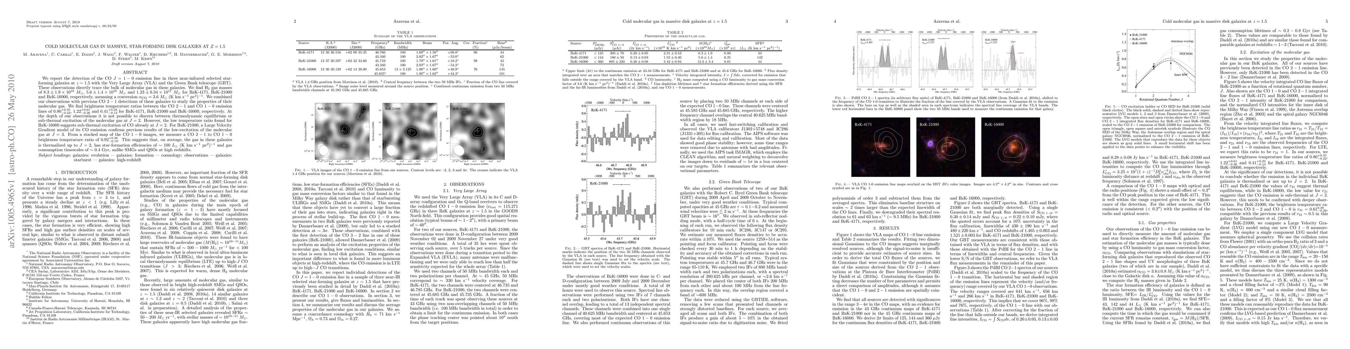 Researchers detected cold molecular gas in three galaxies at z=1.5, finding average star-formation efficiencies of ~100 L_sun (K km s^{-1} pc^2)^{-1}. The results suggest that these galaxies have thermalized gas up to J=2 and consumption timescales of ~0.4 Gyr.