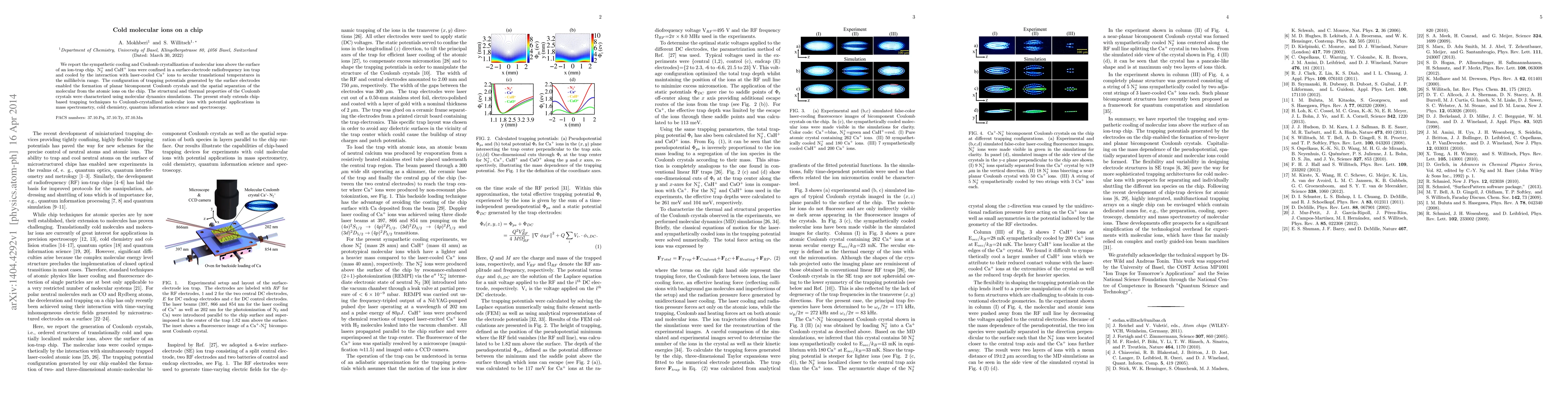 This paper details the sympathetic cooling and Coulomb crystallization of molecular ions (N$_2^+$ and CaH$^+$) on an ion-trap chip using laser-cooled Ca$^{+}$ ions, achieving millikelvin temperatures. The study demonstrates the formation of planar bicomponent Coulomb crystals and their potential applications in mass spectrometry, cold chemistry, quantum information science, and spectroscopy.