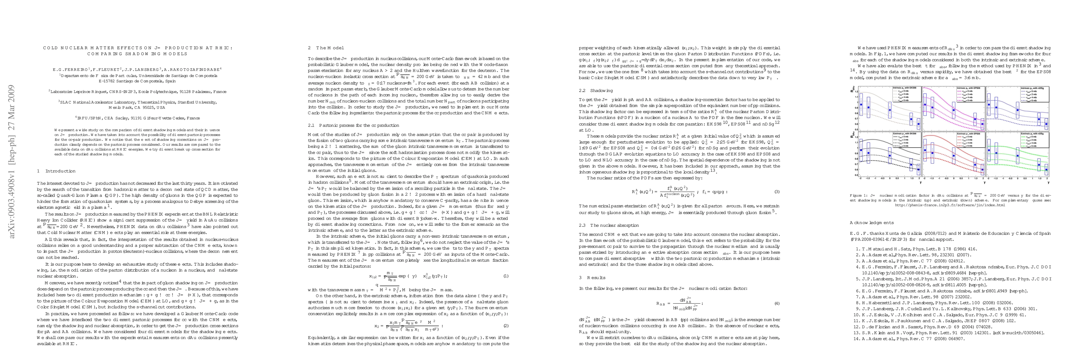 We present a wide study on the comparison of different shadowing models and their influence on \jpsi production. We have taken into account the possibility of different partonic processes for the $c \bar c$-pair production. We notice that the effect of shadowing corrections on \jpsi production clearly depends on the partonic process considered. Our results are compared to the available data on \dAu collisions at RHIC energies. We try different break up cross section for each of the studied shadowing models.