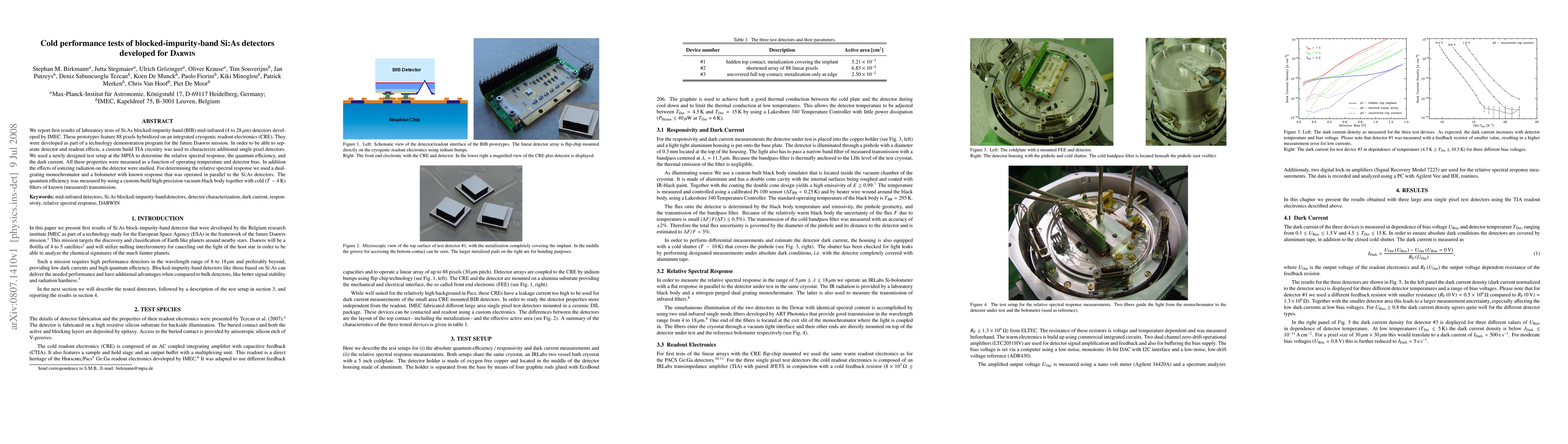 This paper presents initial test results for Si:As blocked-impurity-band detectors, designed for the DARWIN mission. Using a custom setup, researchers measured spectral response, quantum efficiency, and dark current at various temperatures and biases. They also assessed radiation effects, employing a dual-grating monochromator and a known-response bolometer for accuracy.
