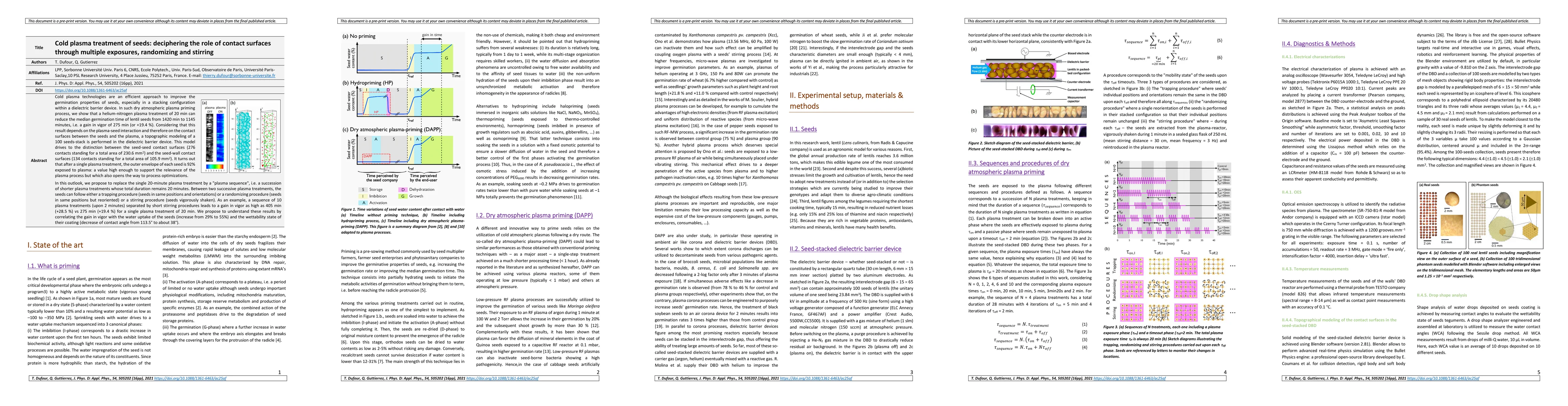 Cold plasma technologies are an efficient approach to improve the germination properties of seeds, especially in a stacking configuration within a dielectric barrier device. In such dry atmospheric plasma priming process, we show that a He-N2 plasma treatment of 20 min can reduce the median germination time of lentil seeds from 1420 min to 1145 minutes, ie a gain in vigor of 275 min (or +19.4 %). Considering that this result depends on the plasma-seed interaction and therefore on the contact surfaces between the seeds and the plasma, a topographic modeling of a 100 seeds-stack is performed in the dielectric barrier device. This model drives to the distinction between the seed-seed contact surfaces (276 contacts standing for a total area of 230.6 mm2) and the seed-wall contact surfaces (134 contacts standing for a total area of 105.9 mm2). After a single plasma treatment, the outer envelope of each seed is 92% exposed to plasma: a value high enough to support the relevance of the plasma process but which also opens the way to process optimizations. In this outlook, we propose to replace the single 20-minute plasma treatment by a "plasma sequence", ie a succession of shorter plasma treatments whose total duration remains 20 min. Between two successive plasma treatments, the seeds can follow either a trapping procedure (seeds in same positions and orientations) or a randomizing procedure (seeds in same positions but reoriented) or a stirring procedure (seeds vigorously shaken). A sequence of 10 plasma treatments (upon 2 min) separated by short stirring procedures leads to a gain in vigor as high as 405 min vs 275 min for a single plasma treatment of 20 min. We propose to understand these results by correlating the gain in vigor with the water uptake of the seeds and the wettability state of their coating.