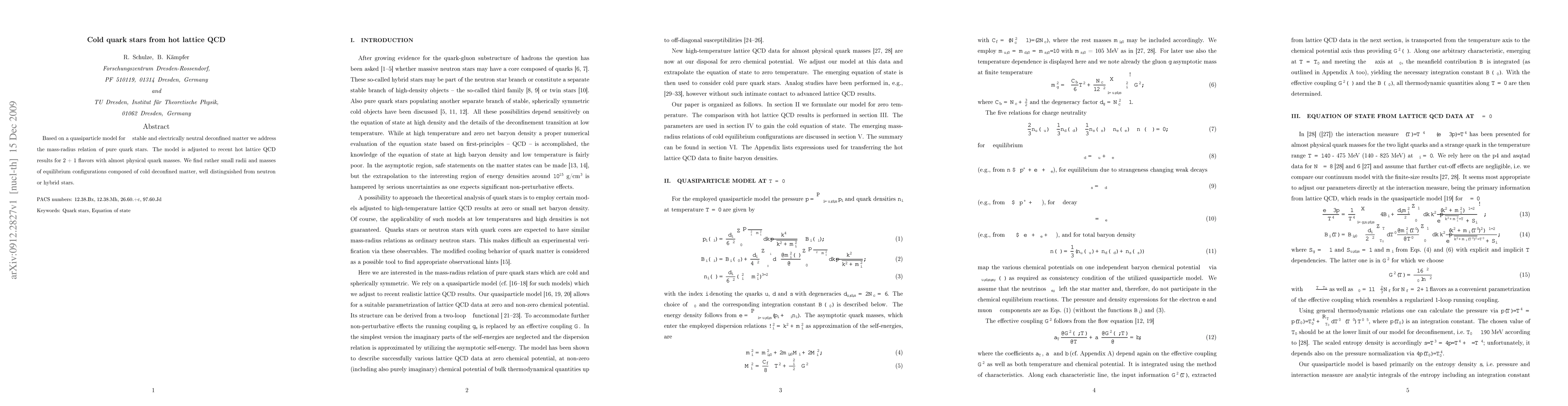 This paper investigates the mass-radius relation of pure quark stars using a quasiparticle model calibrated to recent hot lattice QCD data for 2+1 flavors of quarks. The findings suggest that cold quark stars have small radii and masses, differing significantly from neutron or hybrid stars.