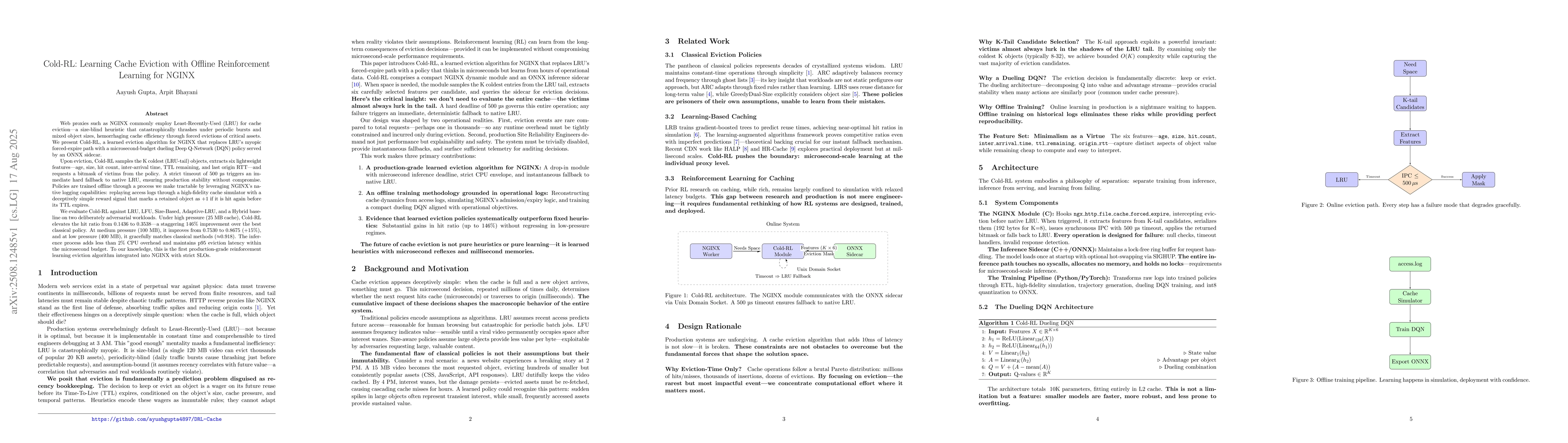Web proxies such as NGINX commonly rely on least-recently-used (LRU) eviction, which is size agnostic and can thrash under periodic bursts and mixed object sizes. We introduce Cold-RL, a learned eviction policy for NGINX that replaces LRU's forced-expire path with a dueling Deep Q-Network served by an ONNX sidecar within a strict microsecond budget. On each eviction, Cold-RL samples the K least-recently-used objects, extracts six lightweight features (age, size, hit count, inter-arrival time, remaining TTL, and last origin RTT), and requests a bitmask of victims; a hard timeout of 500 microseconds triggers immediate fallback to native LRU. Policies are trained offline by replaying NGINX access logs through a cache simulator with a simple reward: a retained object earns one point if it is hit again before TTL expiry. We compare against LRU, LFU, size-based, adaptive LRU, and a hybrid baseline on two adversarial workloads. With a 25 MB cache, Cold-RL raises hit ratio from 0.1436 to 0.3538, a 146 percent improvement over the best classical baseline; at 100 MB, from 0.7530 to 0.8675, a 15 percent gain; and at 400 MB it matches classical methods (about 0.918). Inference adds less than 2 percent CPU overhead and keeps 95th percentile eviction latency within budget. To our knowledge, this is the first reinforcement learning eviction policy integrated into NGINX with strict SLOs.