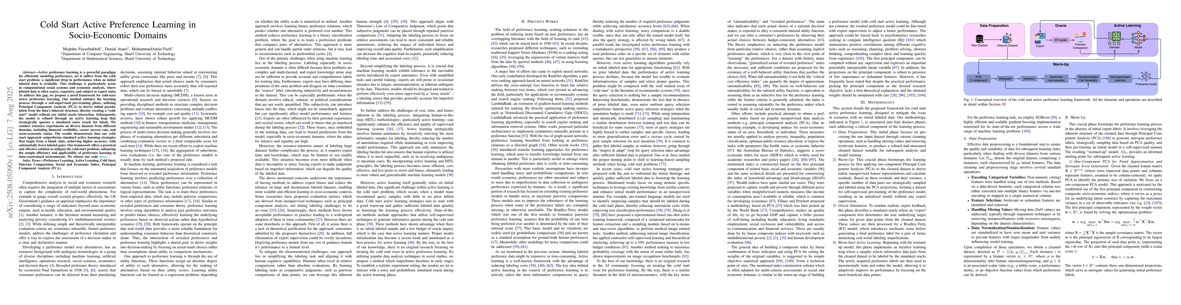 Active preference learning is a powerful paradigm for efficiently modeling preferences, yet it suffers from the cold-start problem: a significant drop in performance when no initial labeled data is available. This challenge is particularly acute in computational social systems and economic analysis, where labeled data is often scarce, expensive, and subject to expert noise. To address this gap, we propose a novel framework for cold-start active preference learning. Our method initiates the learning process through a self-supervised pre-training phase, utilizing Principal Component Analysis (PCA) to derive initial pseudo-labels from the data's inherent structure, thereby creating a cold-start model without any initial oracle interaction. Subsequently, the model is refined through an active learning loop that strategically queries a simulated noisy oracle for labels. We conduct extensive experiments on diverse datasets from different domains, including financial credibility, career success rate, and socio-economic status. The results demonstrate that our cold-start approach outperforms standard active learning strategies that begin from a blank slate, achieving higher accuracy with substantially fewer labeled pairs. Our framework offers a practical and effective solution to mitigate the cold-start problem, enhancing the sample efficiency and applicability of preference learning in data-constrained environments. We release our code at https://github.com/Dan-A2/cold-start-preference-learning