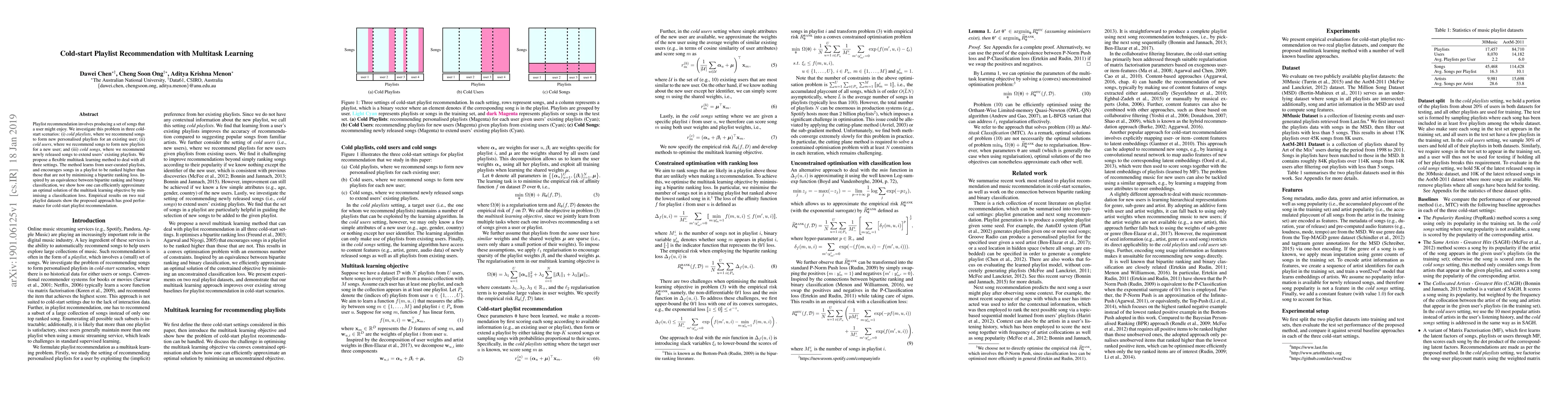 This paper proposes a multitask learning method for cold-start playlist recommendation, addressing three scenarios: new playlists for existing users, new playlists for new users, and recommendations for newly released songs. The method leverages user-curated playlists and a bipartite ranking loss to efficiently approximate an optimal solution, demonstrating good performance on real datasets.