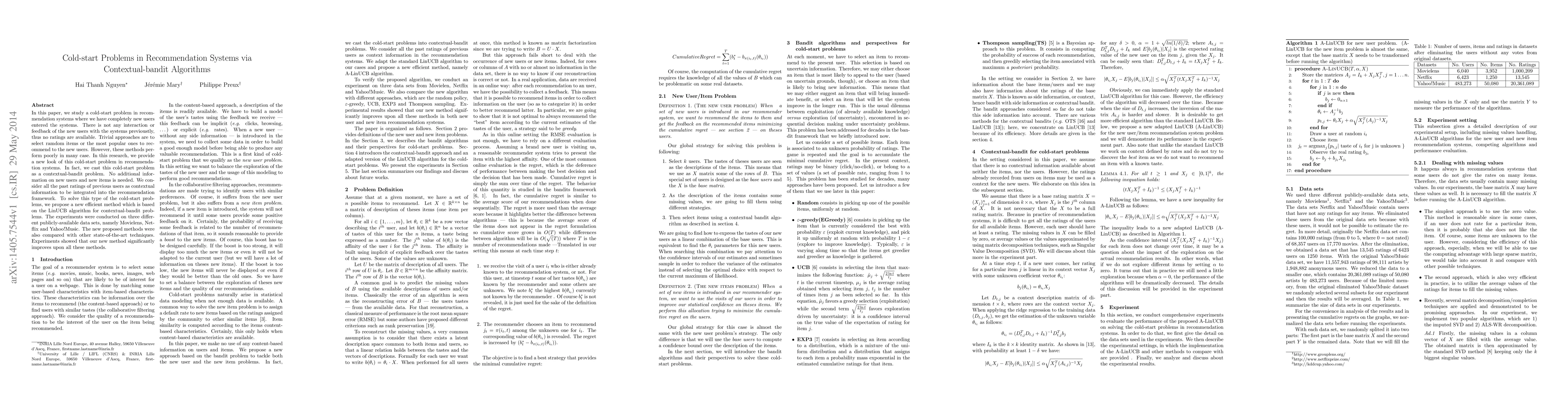 This paper addresses the cold-start problem in recommendation systems for new users by framing it as a contextual-bandit problem. It proposes an efficient method based on the LinUCB algorithm, leveraging past user ratings as contextual information, and demonstrates significant improvements over state-of-the-art techniques on three datasets.