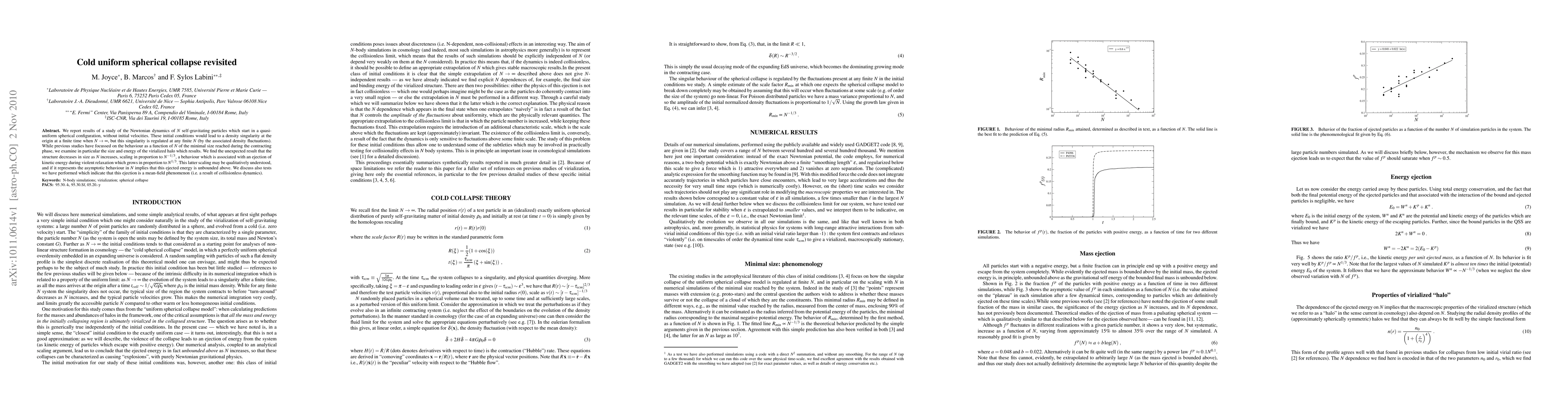 We report results of a study of the Newtonian dynamics of N self-gravitating particles which start in a quasi-uniform spherical configuration, without initial velocities. These initial conditions would lead to a density singularity at the origin at a finite time when N \rightarrow \infty, but this singularity is regulated at any finite N (by the associated density fluctuations). While previous studies have focussed on the behaviour as a function of N of the minimal size reached during the contracting phase, we examine in particular the size and energy of the virialized halo which results. We find the unexpected result that the structure decreases in size as N increases, scaling in proportion to N^{-1/3}, a behaviour which is associated with an ejection of kinetic energy during violent relaxation which grows in proportion to N^{1/3}. This latter scaling may be qualitatively understood, and if it represents the asymptotic behaviour in N implies that this ejected energy is unbounded above. We discuss also tests we have performed which indicate that this ejection is a mean-field phenomenon (i.e. a result of collisionless dynamics).