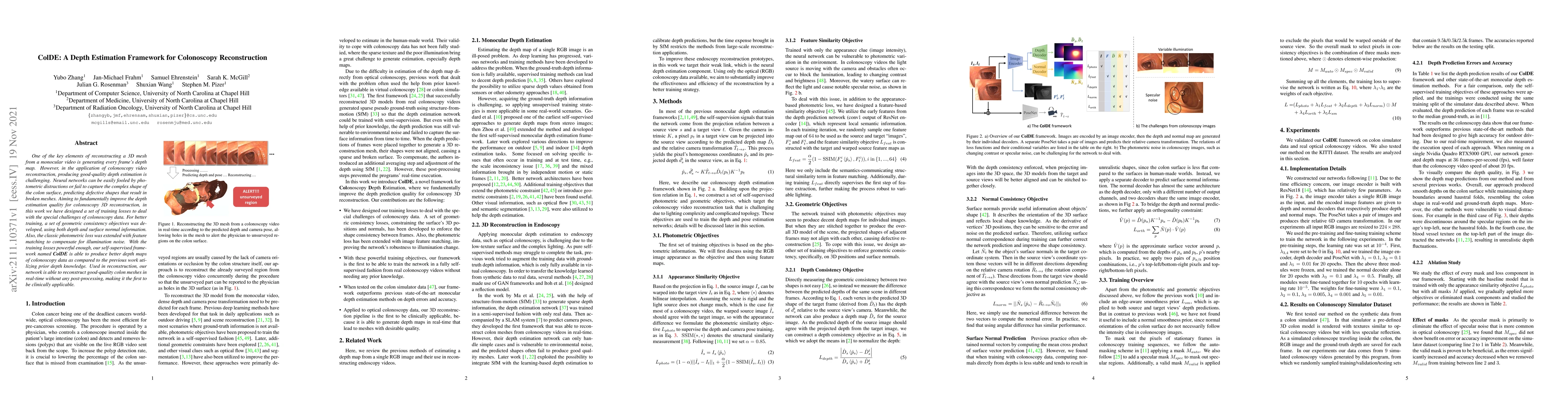 ColDE is a self-supervised framework designed to improve depth estimation for colonoscopy video reconstruction, addressing challenges like photometric distractions and complex colon shapes. It employs specialized training losses, including geometric consistency objectives and enhanced photometric loss with feature matching, to produce high-quality depth maps and reconstruct accurate, real-time 3D colon meshes.