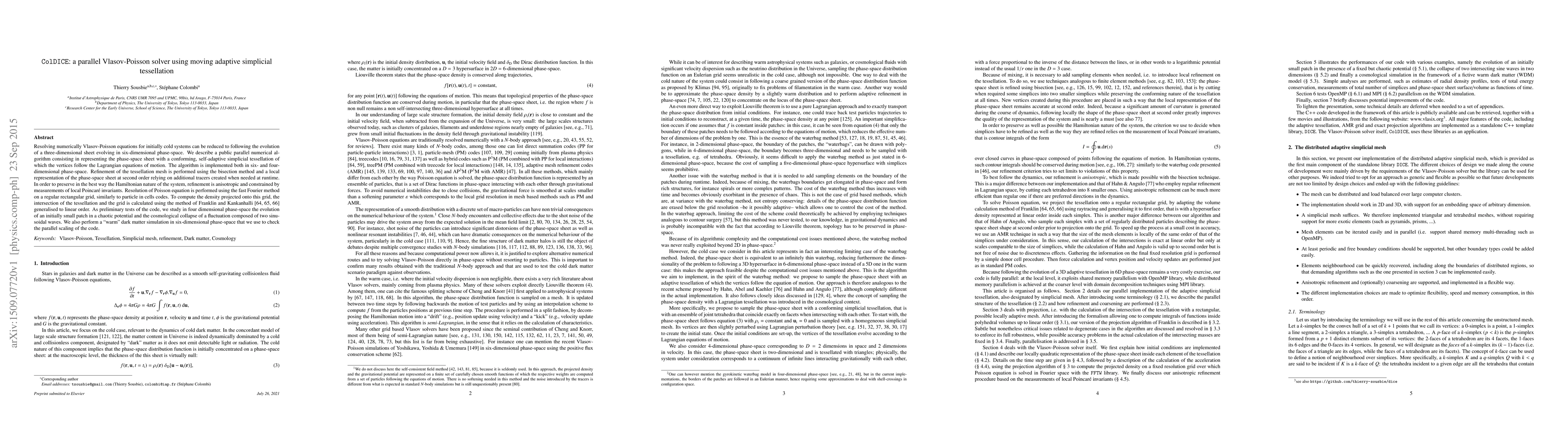 ColDICE is a parallel numerical algorithm for solving Vlasov-Poisson equations in cold systems by adaptively conforming to a phase-space sheet with a self-adaptive simplicial tessellation. The algorithm employs anisotropic refinement and the fast Fourier method for Poisson's equation, demonstrating scalability through simulations of chaotic potentials and cosmological collapse.