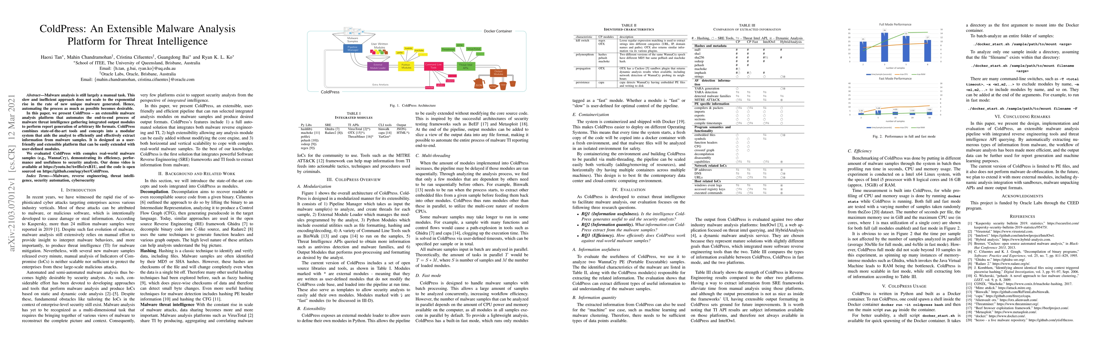 ColdPress is an extensible platform for automating malware analysis, combining advanced tools to facilitate threat intelligence gathering. It was evaluated with real-world malware like WannaCry, showing its efficiency and utility for security analysts.