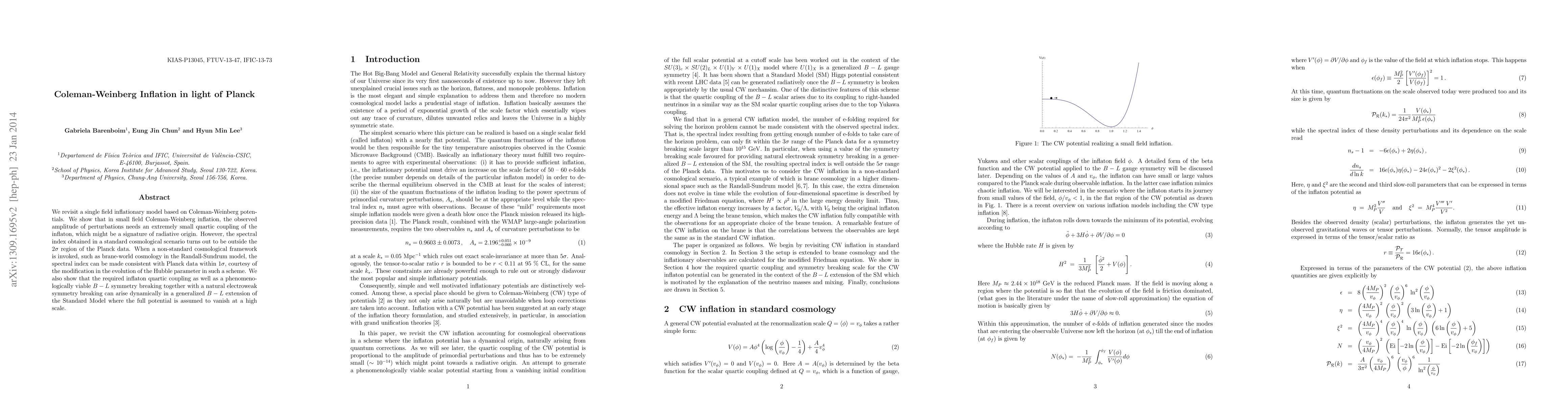 This paper revisits Coleman-Weinberg inflation, finding that a small field model requires an extremely small quartic coupling for consistency with observed perturbations. However, it conflicts with Planck data on the spectral index unless a non-standard cosmological framework like brane-world cosmology is adopted.
