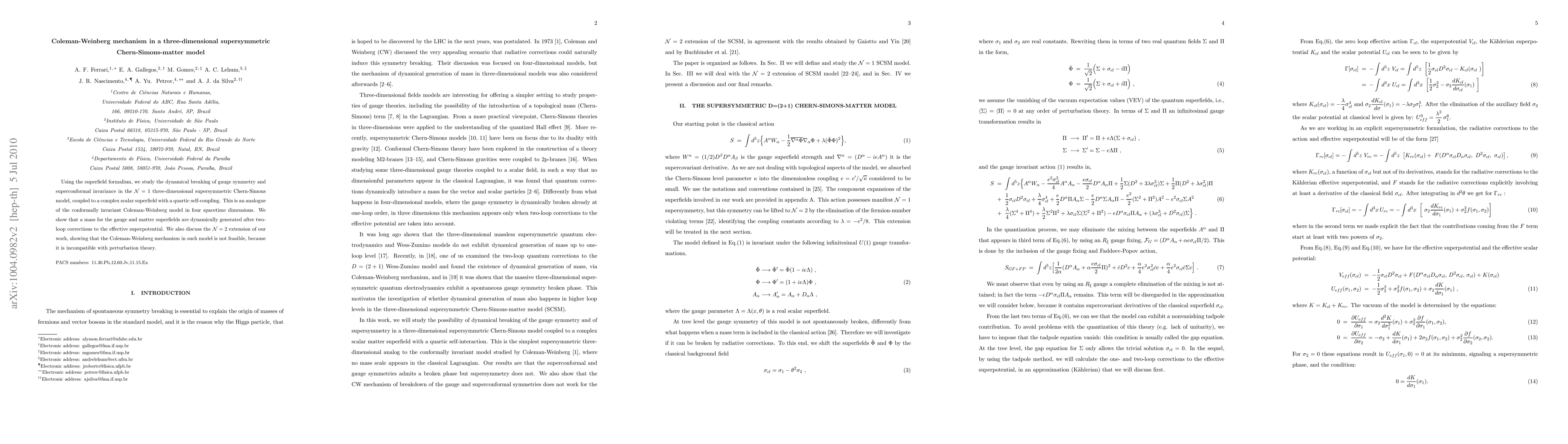 This paper investigates the dynamical breaking of gauge symmetry in a three-dimensional supersymmetric Chern-Simons-matter model using superfield formalism, demonstrating the Coleman-Weinberg mechanism's analogue in generating masses via two-loop corrections. It also finds that extending the model to N=2 supersymmetry makes the Coleman-Weinberg mechanism infeasible due to perturbative incompatibility.