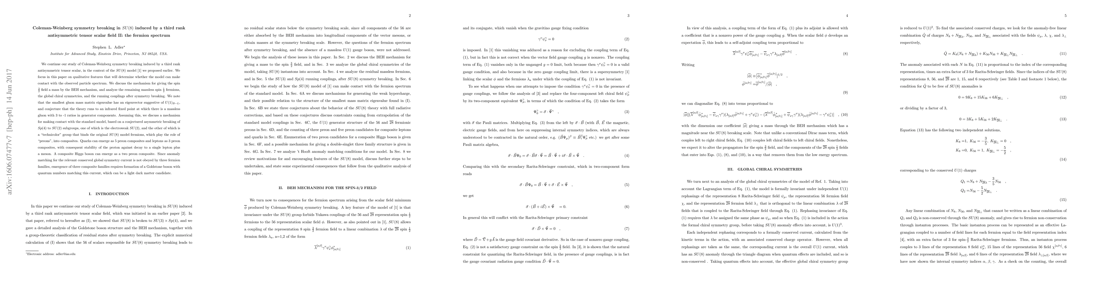 We continue our study of Coleman-Weinberg symmetry breaking induced by a third rank antisymmetric tensor scalar, in the context of the $SU(8)$ model we proposed earlier. We focus in this paper on qualitative features that will determine whether the model can make contact with the observed particle spectrum. We discuss the mechanism for giving the spin $\frac{3}{2}$ field a mass by the BEH mechanism, and analyze the remaining massless spin $\frac{1}{2}$ fermions, the global chiral symmetries, and the running couplings after symmetry breaking. We note that the smallest gluon mass matrix eigenvalue has an eigenvector suggestive of $U(1)_{B-L}$, and conjecture that the theory runs to an infrared fixed point at which there is a massless gluon with 3 to -1 ratios in generator components. Assuming this, we discuss a mechanism for making contact with the standard model, based on a conjectured asymmetric breaking of $Sp(4)$ to $SU(2)$ subgroups, one of which is the electroweak $SU(2)$, and the other of which is a "technicolor" group that binds the original $SU(8)$ model fermions, which play the role of "preons", into composites. Quarks can emerge as 5 preon composites and leptons as 3 preon composites, with consequent stability of the proton against decay to a single lepton plus a meson. A composite Higgs boson can emerge as a two preon composite. Since anomaly matching for the relevant conserved global symmetry current is not obeyed by three fermion families, emergence of three composite families requires formation of a Goldstone boson with quantum numbers matching this current, which can be a light dark matter candidate.