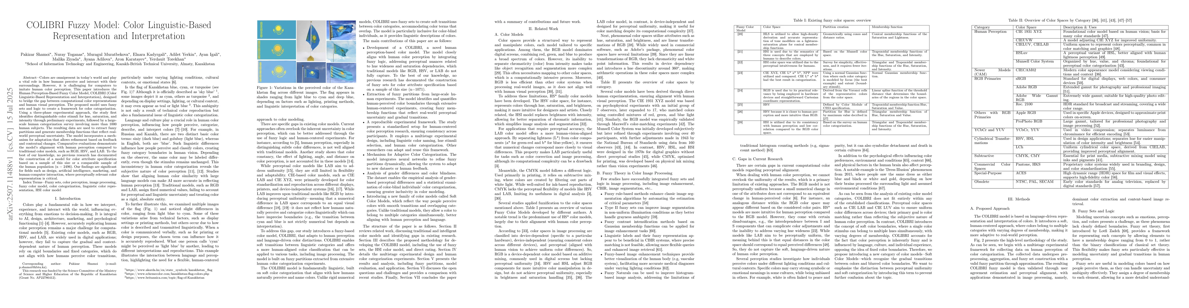 Colors are omnipresent in today's world and play a vital role in how humans perceive and interact with their surroundings. However, it is challenging for computers to imitate human color perception. This paper introduces the Human Perception-Based Fuzzy Color Model, COLIBRI (Color Linguistic-Based Representation and Interpretation), designed to bridge the gap between computational color representations and human visual perception. The proposed model uses fuzzy sets and logic to create a framework for color categorization. Using a three-phase experimental approach, the study first identifies distinguishable color stimuli for hue, saturation, and intensity through preliminary experiments, followed by a large-scale human categorization survey involving more than 1000 human subjects. The resulting data are used to extract fuzzy partitions and generate membership functions that reflect real-world perceptual uncertainty. The model incorporates a mechanism for adaptation that allows refinement based on feedback and contextual changes. Comparative evaluations demonstrate the model's alignment with human perception compared to traditional color models, such as RGB, HSV, and LAB. To the best of our knowledge, no previous research has documented the construction of a model for color attribute specification based on a sample of this size or a comparable sample of the human population (n = 2496). Our findings are significant for fields such as design, artificial intelligence, marketing, and human-computer interaction, where perceptually relevant color representation is critical.