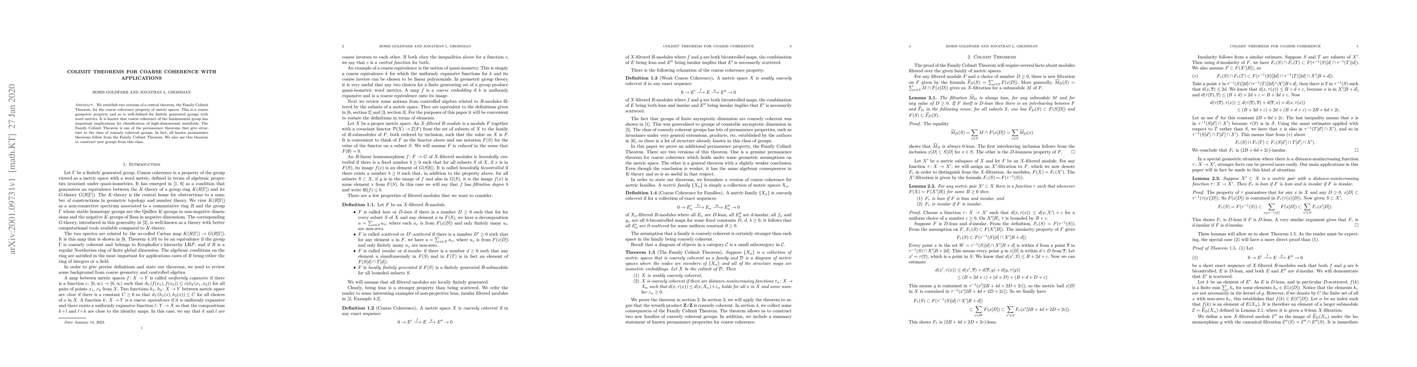 The paper establishes two versions of the Family Colimit Theorem for coarse coherence in metric spaces, crucial for classifying high-dimensional manifolds, and demonstrates its use in constructing new groups within this class.