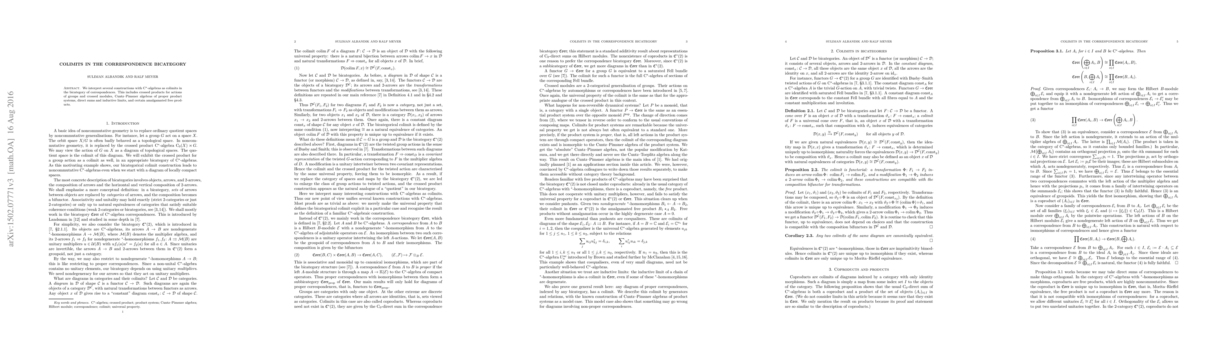 This paper explores the interpretation of various constructions involving C*-algebras, such as crossed products and Cuntz-Pimsner algebras, as colimits within the bicategory of correspondences. It focuses on how these mathematical structures align with colimit processes in this context.