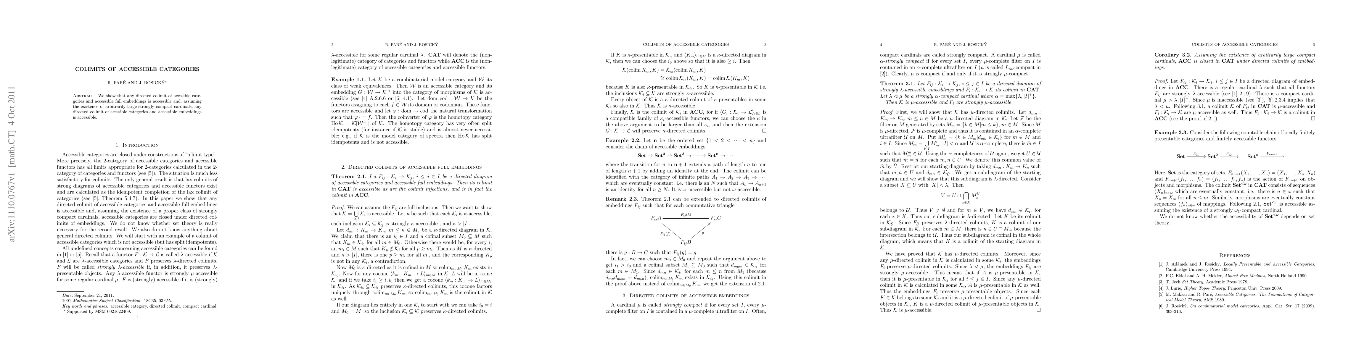 This paper demonstrates that directed colimits of accessible categories and accessible full embeddings remain accessible. Additionally, it proves that under the assumption of large strongly compact cardinals, directed colimits of accessible categories and accessible embeddings are also accessible.