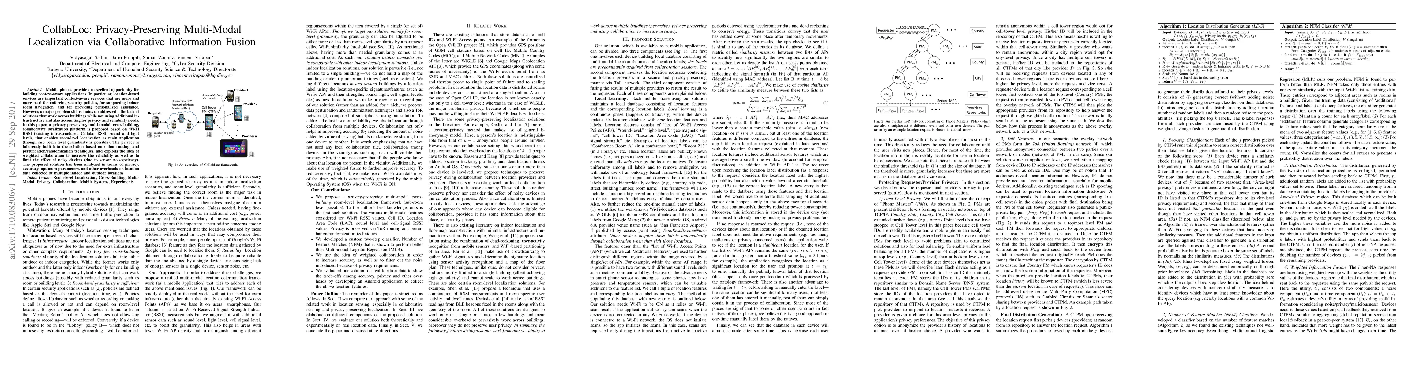 Mobile phones provide an excellent opportunity for building context-aware applications. In particular, location-based services are important context-aware services that are more and more used for enforcing security policies, for supporting indoor room navigation, and for providing personalized assistance. However, a major problem still remains unaddressed---the lack of solutions that work across buildings while not using additional infrastructure and also accounting for privacy and reliability needs. In this paper, a privacy-preserving, multi-modal, cross-building, collaborative localization platform is proposed based on Wi-Fi RSSI (existing infrastructure), Cellular RSSI, sound and light levels, that enables room-level localization as main application (though sub room level granularity is possible). The privacy is inherently built into the solution based on onion routing, and perturbation/randomization techniques, and exploits the idea of weighted collaboration to increase the reliability as well as to limit the effect of noisy devices (due to sensor noise/privacy). The proposed solution has been analyzed in terms of privacy, accuracy, optimum parameters, and other overheads on location data collected at multiple indoor and outdoor locations using an Android app.