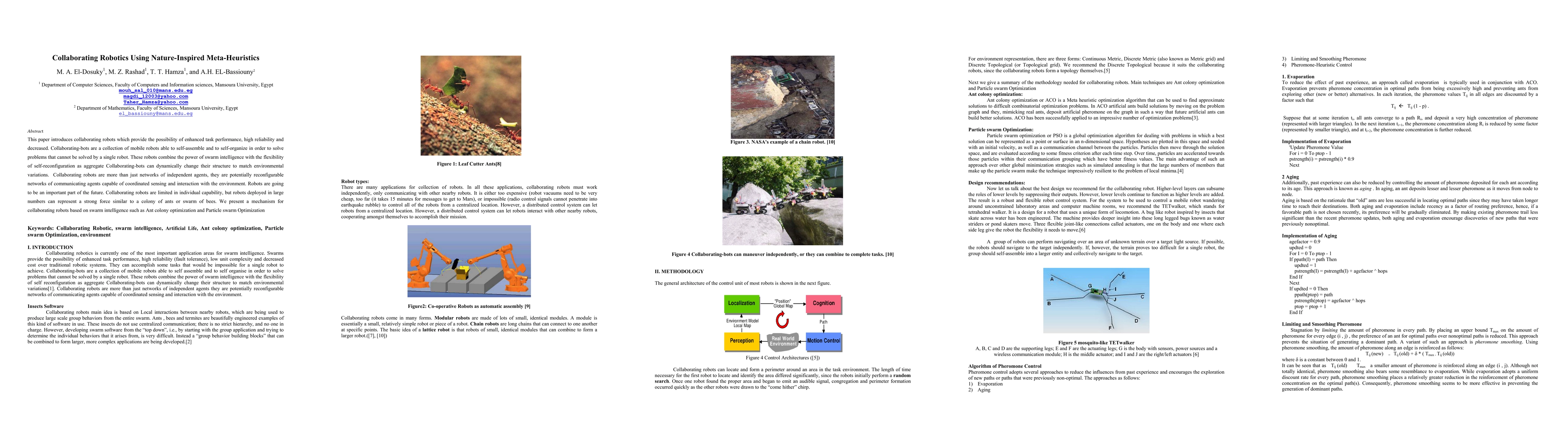 This paper introduces collaborating robots that combine swarm intelligence with self-reconfiguration to solve complex problems. It presents a mechanism for these robots using nature-inspired meta-heuristics like Ant colony optimization and Particle Swarm Optimization.