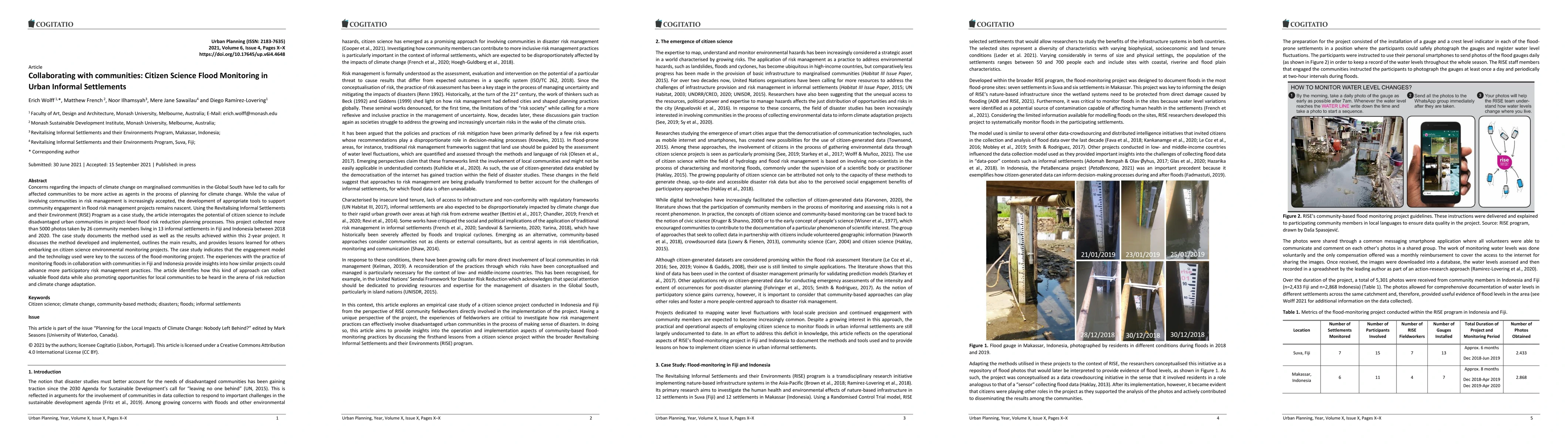 Concerns regarding the impacts of climate change on marginalised communities in the Global South have led to calls for affected communities to be more active as agents in the process of planning for climate change. While the value of involving communities in risk management is increasingly accepted, the development of appropriate tools to support community engagement in flood risk management projects remains nascent. Using the Revitalising Informal Settlements and their Environment (RISE) Program as a case study, the article interrogates the potential of citizen science to include disadvantaged urban communities in project-level flood risk reduction planning processes. This project collected more than 5000 photos taken by 26 community members living in 13 informal settlements in Fiji and Indonesia between 2018 and 2020. The case study documents the method used as well as the results achieved within this 2-year project. It discusses the method developed and implemented, outlines the main results, and provides lessons learned for others embarking on citizen science environmental monitoring projects. The case study indicates that the engagement model and the technology used were key to the success of the flood-monitoring project. The experiences with the practice of monitoring floods in collaboration with communities in Fiji and Indonesia provide insights into how similar projects could advance more participatory risk management practices. The article identifies how this kind of approach can collect valuable flood data while also promoting opportunities for local communities to be heard in the arena of risk reduction and climate change adaptation.
