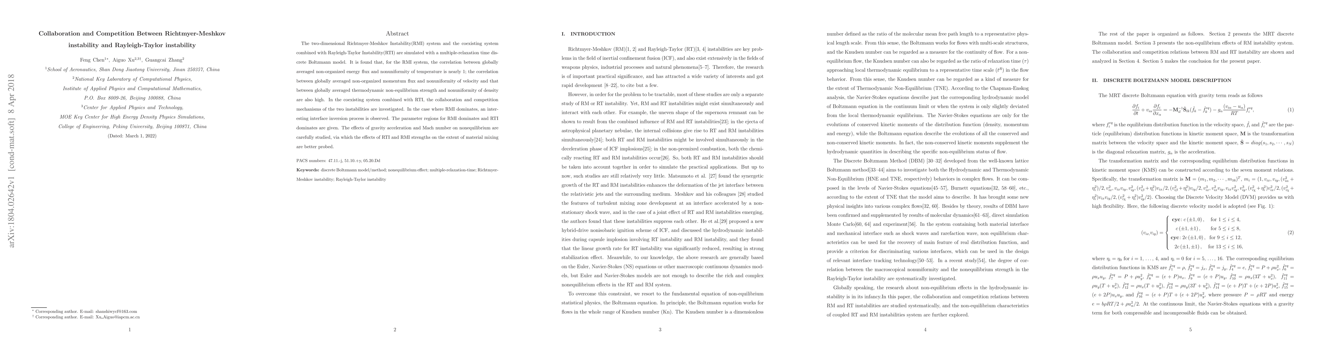 The two-dimensional Richtmyer-Meshkov Instability(RMI) system and the coexisting system combined with Rayleigh-Taylor Instability(RTI) are simulated with a multiple-relaxation time discrete Boltzmann model. It is found that, for the RMI system, the correlation between globally averaged non-organized energy flux and nonuniformity of temperature is nearly 1; the correlation between globally averaged non-organized momentum flux and nonuniformity of velocity and that between globally averaged thermodynamic non-equilibrium strength and nonuniformity of density are also high. In the coexisting system combined with RTI, the collaboration and competition mechanisms of the two instabilities are investigated. In the case where RMI dominates, an interesting interface inversion process is observed. The parameter regions for RMI dominates and RTI dominates are given. The effects of gravity acceleration and Mach number on nonequilibrium are carefully studied, via which the effects of RTI and RMI strengths on the extent of material mixing are better probed.