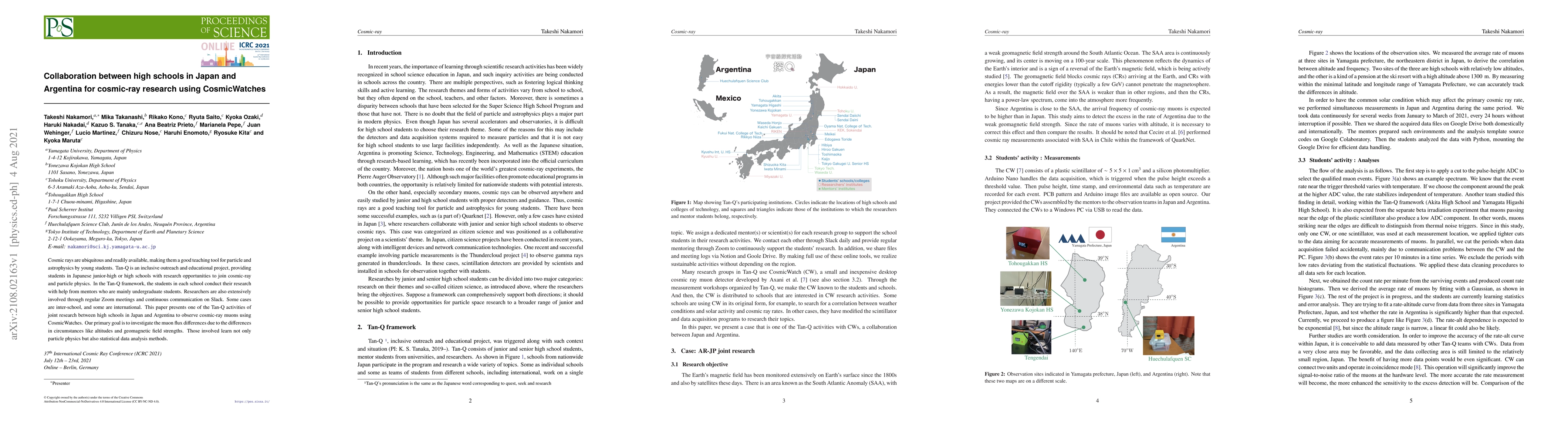 Cosmic rays are ubiquitous and readily available, making them a good teaching tool for particle and astrophysics by young students. Tan-Q is an inclusive outreach and educational project, providing students in Japanese junior-high or high schools with research opportunities to join cosmic-ray and particle physics. In the Tan-Q framework, the students in each school conduct their research with help from mentors who are mainly undergraduate students. Researchers are also extensively involved through regular Zoom meetings and continuous communication on Slack. Some cases are inter-school, and some are international. This paper presents one of the Tan-Q activities of joint research between high schools in Japan and Argentina to observe cosmic-ray muons using CosmicWatches. Our primary goal is to investigate the muon flux differences due to the differences in circumstances like altitudes and geomagnetic field strengths. Those involved learn not only particle physics but also statistical data analysis methods.