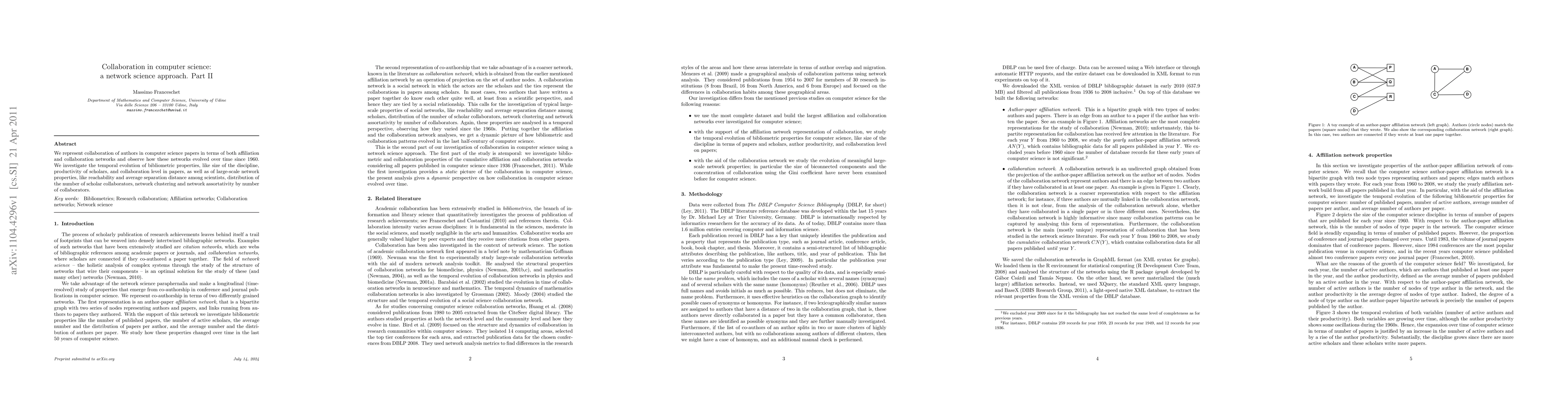 We represent collaboration of authors in computer science papers in terms of both affiliation and collaboration networks and observe how these networks evolved over time since 1960. We investigate the temporal evolution of bibliometric properties, like size of the discipline, productivity of scholars, and collaboration level in papers, as well as of large-scale network properties, like reachability and average separation distance among scientists, distribution of the number of scholar collaborators, network clustering and network assortativity by number of collaborators.