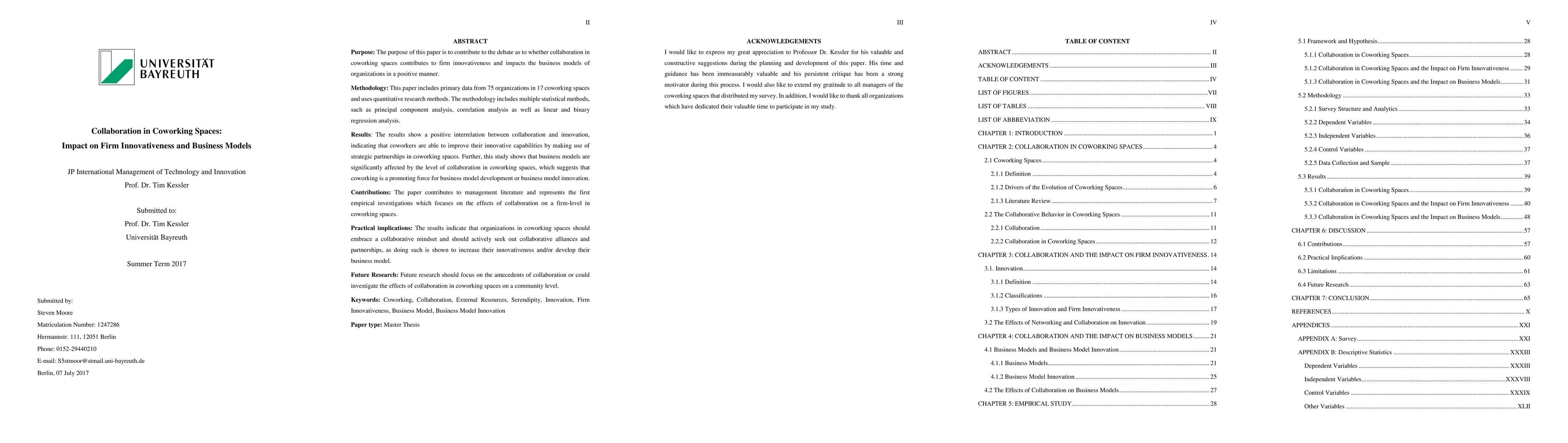 This paper investigates the impact of collaboration in coworking spaces on firm innovativeness and business models, finding a positive correlation between collaboration and innovation, and significant effects on business model development. The study recommends that organizations in coworking spaces should foster collaboration to enhance innovation and business model innovation.
