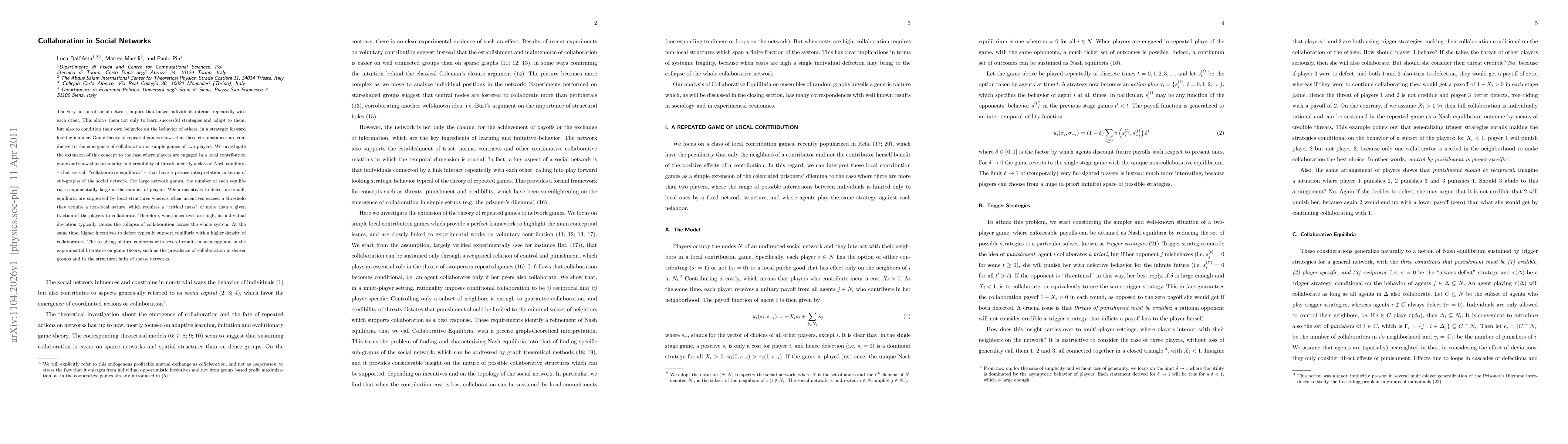 Research shows that collaboration in social networks emerges when incentives to defect are low, but collapses when incentives are high, with denser groups and structural hubs of sparse networks supporting higher levels of collaboration.