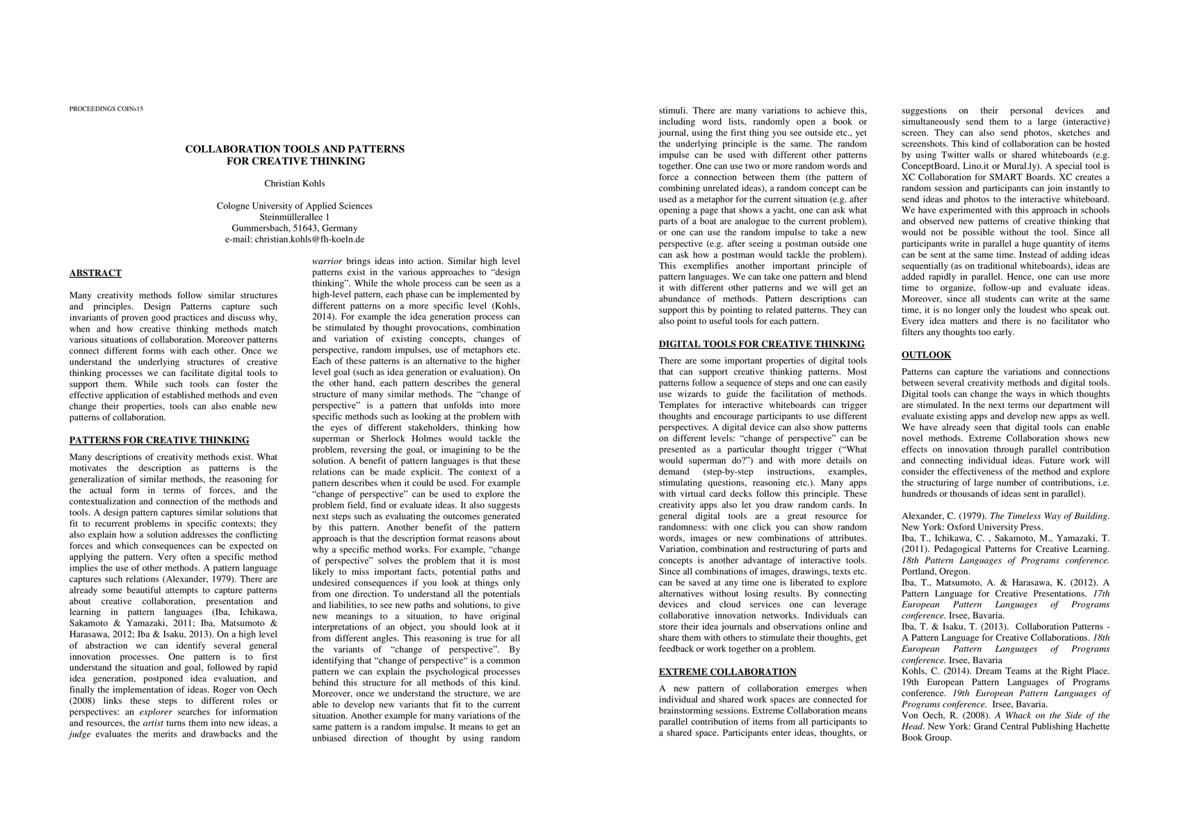 Many creativity methods follow similar structures and principles. Design Patterns capture such invariants of proven good practices and discuss why, when and how creative thinking methods match various situations of collaboration. Moreover patterns connect different forms with each other. Once we understand the underlying structures of creative thinking processes we can facilitate digital tools to support them. While such tools can foster the effective application of established methods and even change their properties, tools can also enable new patterns of collaboration.