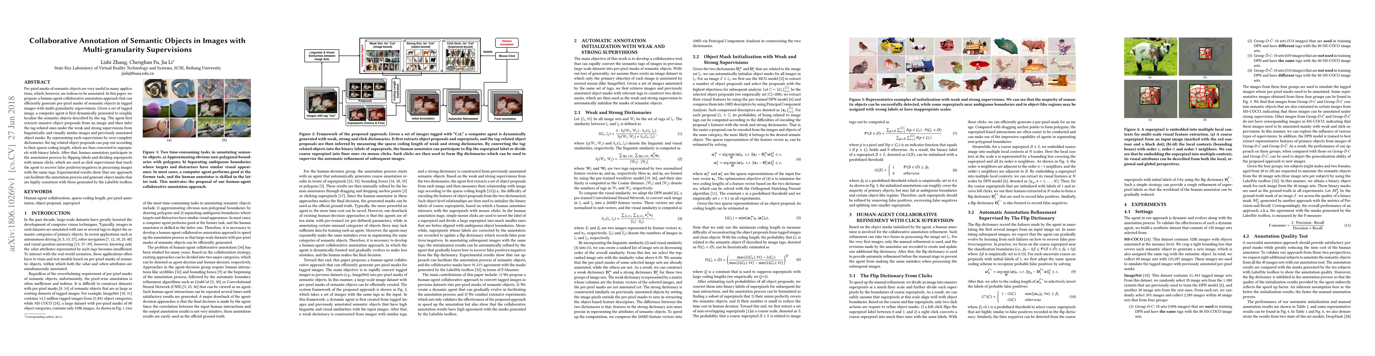 Per-pixel masks of semantic objects are very useful in many applications, which, however, are tedious to be annotated. In this paper, we propose a human-agent collaborative annotation approach that can efficiently generate per-pixel masks of semantic objects in tagged images with multi-granularity supervisions. Given a set of tagged image, a computer agent is first dynamically generated to roughly localize the semantic objects described by the tag. The agent first extracts massive object proposals from an image and then infer the tag-related ones under the weak and strong supervisions from linguistically and visually similar images and previously annotated object masks. By representing such supervisions by over-complete dictionaries, the tag-related object proposals can pop-out according to their sparse coding length, which are then converted to superpixels with binary labels. After that, human annotators participate in the annotation process by flipping labels and dividing superpixels with mouse clicks, which are used as click supervisions that teach the agent to recover false positives/negatives in processing images with the same tags. Experimental results show that our approach can facilitate the annotation process and generate object masks that are highly consistent with those generated by the LabelMe toolbox.