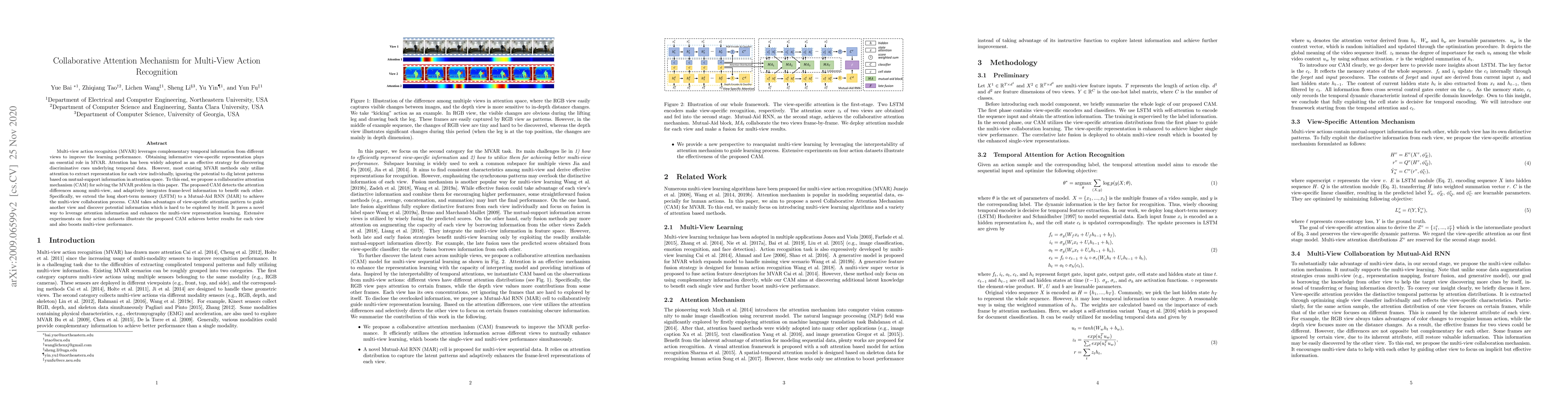 The paper proposes a Collaborative Attention Mechanism (CAM) to enhance multi-view action recognition by leveraging mutual-support information between views through attention. The CAM integrates frame-level information across views using a Mutual-Aid RNN (MAR) to improve representation learning and achieve superior performance on multiple datasets.
