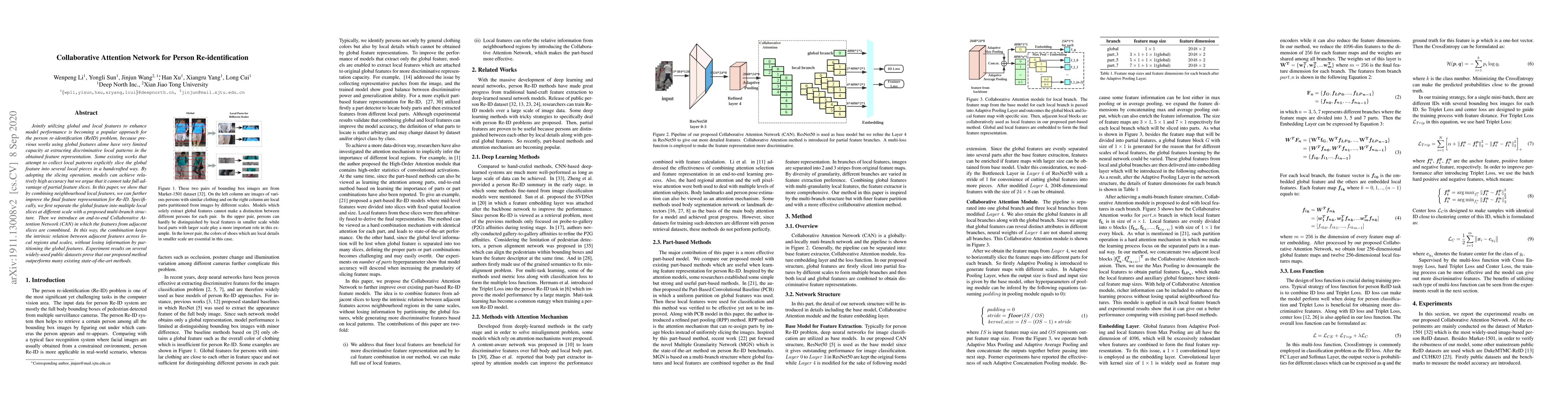 This paper proposes a Collaborative Attention Network for Person Re-identification, which improves model accuracy by jointly utilizing global and local features, without losing information from partitioning the global features.