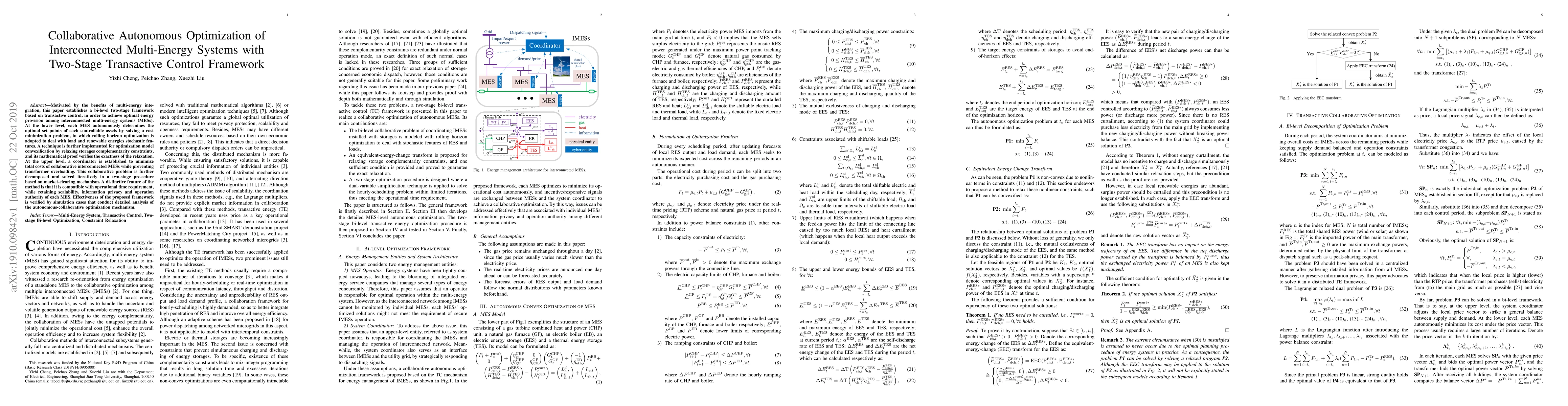This paper proposes a bi-level two-stage transactive control framework for optimizing interconnected multi-energy systems, where each system autonomously determines optimal set points while a coordinator minimizes total costs and prevents transformer overloading. The method ensures scalability and respects operational time requirements.