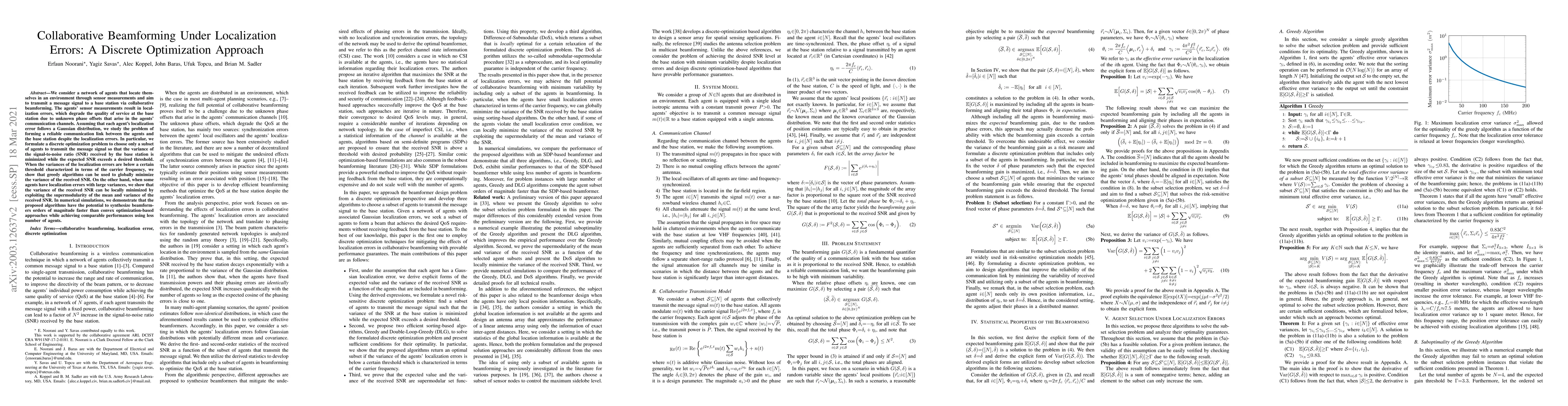 We consider a network of agents that locate themselves in an environment through sensor measurements and aim to transmit a message signal to a base station via collaborative beamforming. The agents' sensor measurements result in localization errors, which degrade the quality of service at the base station due to unknown phase offsets that arise in the agents' communication channels. Assuming that each agent's localization error follows a Gaussian distribution, we study the problem of forming a reliable communication link between the agents and the base station despite the localization errors. In particular, we formulate a discrete optimization problem to choose only a subset of agents to transmit the message signal so that the variance of the signal-to-noise ratio (SNR) received by the base station is minimized while the expected SNR exceeds a desired threshold. When the variances of the localization errors are below a certain threshold characterized in terms of the carrier frequency, we show that greedy algorithms can be used to globally minimize the variance of the received SNR. On the other hand, when some agents have localization errors with large variances, we show that the variance of the received SNR can be locally minimized by exploiting the supermodularity of the mean and variance of the received SNR. In numerical simulations, we demonstrate that the proposed algorithms have the potential to synthesize beamformers orders of magnitude faster than convex optimization-based approaches while achieving comparable performances using less number of agents.