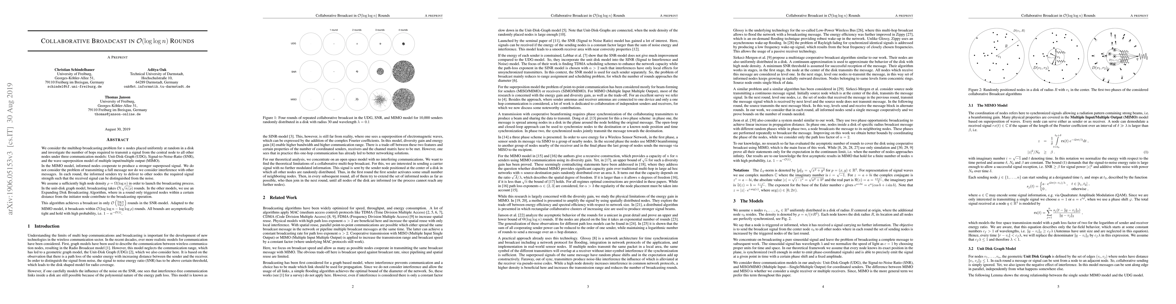 We consider the multihop broadcasting problem for $n$ nodes placed uniformly at random in a disk and investigate the number of hops required to transmit a signal from the central node to all other nodes under three communication models: Unit-Disk-Graph (UDG), Signal-to-Noise-Ratio (SNR), and the wave superposition model of multiple input/multiple output (MIMO). In the MIMO model, informed nodes cooperate to produce a stronger superposed signal. We do not consider the problem of transmitting a full message nor do we consider interference. In each round, the informed senders try to deliver to other nodes the required signal strength such that the received signal can be distinguished from the noise. We assume sufficiently high node density $\rho= \Omega(\log n)$. In the unit-disk graph model, broadcasting needs $O(\sqrt{n/\rho})$ rounds. In the other models, we use an Expanding Disk Broadcasting Algorithm, where in a round only triggered nodes within a certain distance from the initiator node contribute to the broadcasting operation. This algorithm achieves a broadcast in only $O(\frac{\log n}{\log \rho})$ rounds in the SNR-model. Adapted to the MIMO model, it broadcasts within $O(\log \log n - \log \log \rho)$ rounds. All bounds are asymptotically tight and hold with high probability, i.e. $1- n^{-O(1)}$.