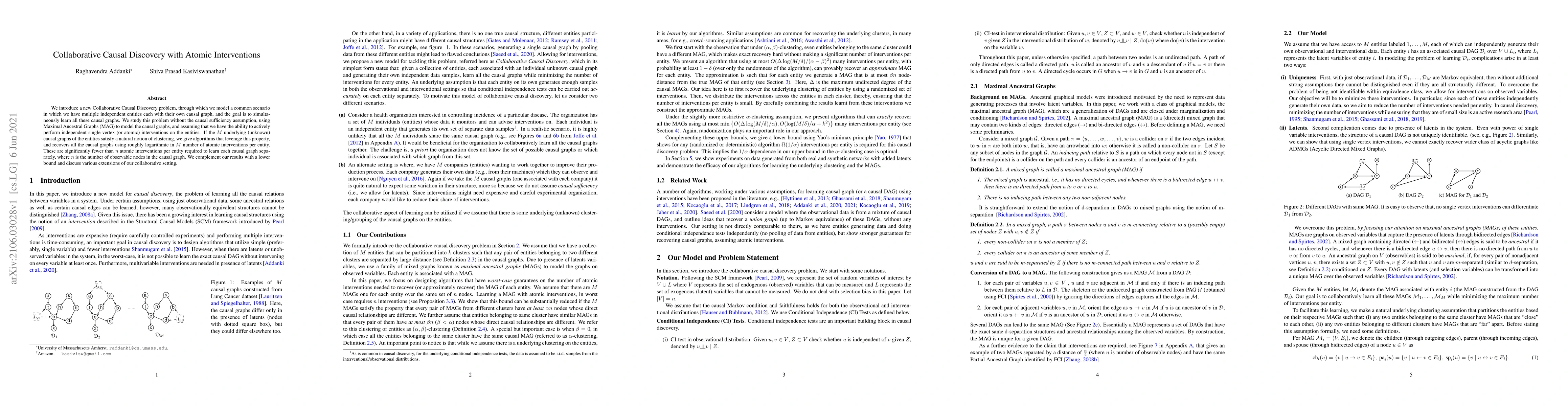 This paper introduces a Collaborative Causal Discovery problem where multiple entities each have their own causal graph, and the goal is to learn all these graphs simultaneously. The authors propose algorithms that leverage clustering among the underlying causal graphs to recover them using significantly fewer atomic interventions compared to learning each graph separately.