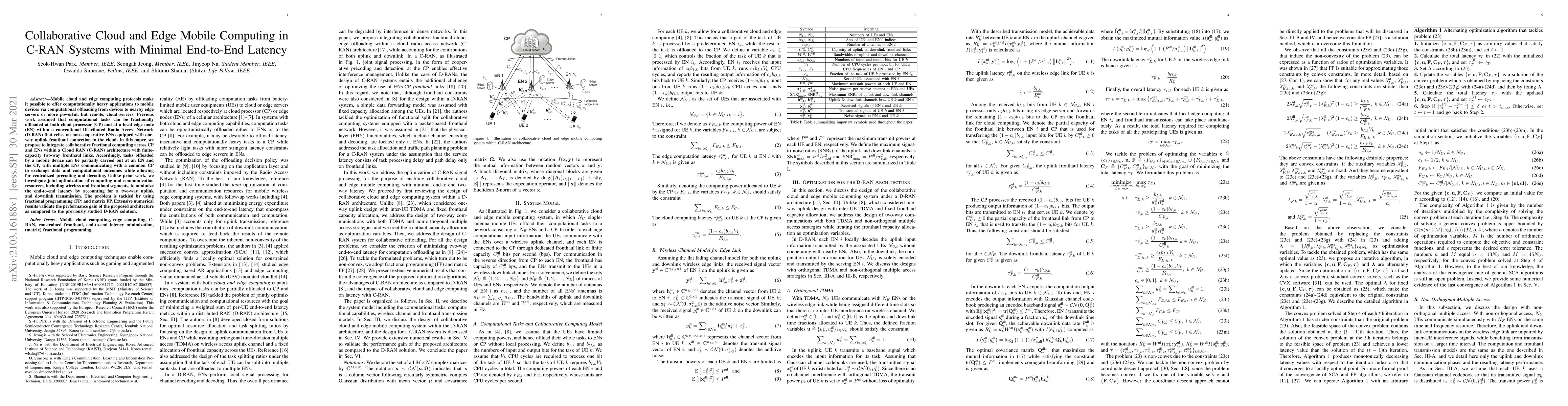 This paper proposes a collaborative computing framework in Cloud RAN (C-RAN) systems that integrates computational offloading between edge nodes and cloud processors to minimize end-to-end latency. The approach optimizes both computing and communication resources, using fractional programming to achieve better performance compared to traditional Distributed Radio Access Network (D-RAN) solutions.