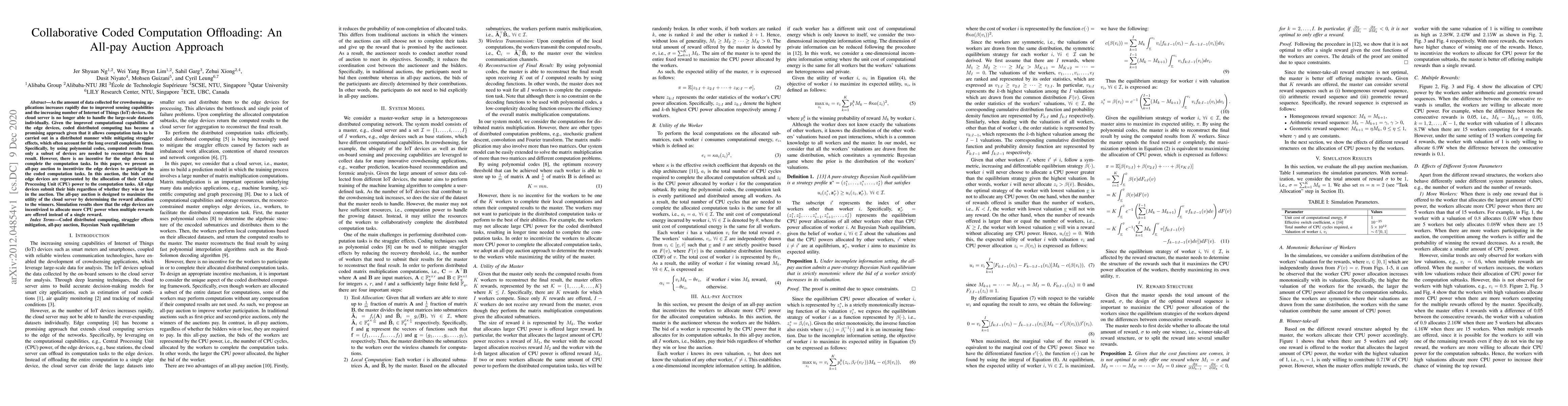 This paper proposes an all-pay auction mechanism to incentivize edge devices to participate in collaborative coded computation offloading for crowdsensing applications. The auction allocates rewards based on CPU power bids, ensuring all devices submit bids regardless of winning, thereby maximizing the cloud server's utility and improving task completion times.