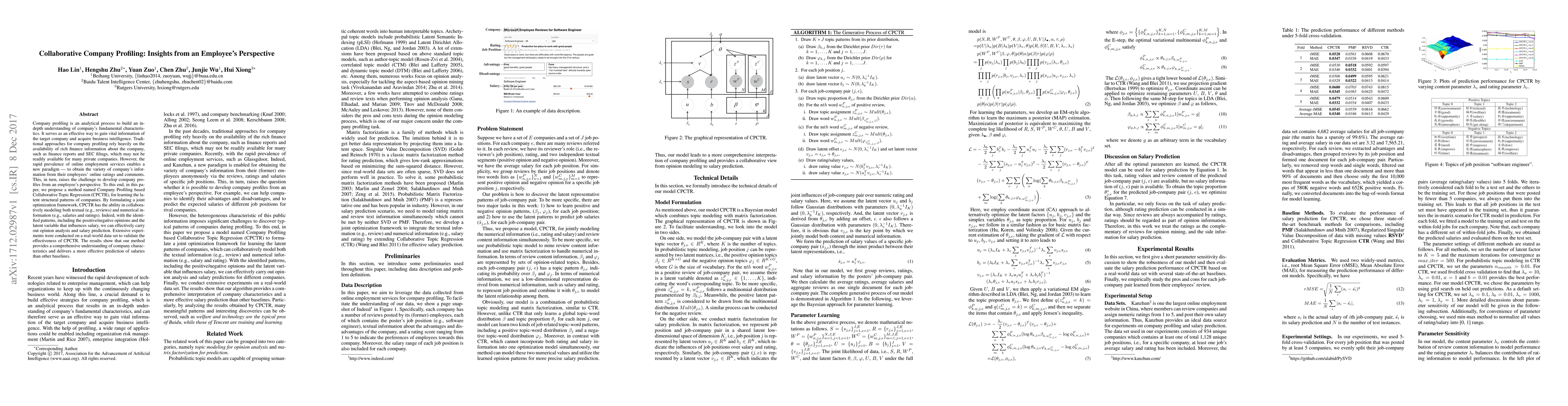 This paper proposes a method called Company Profiling based Collaborative Topic Regression (CPCTR) to create company profiles from employee perspectives using both textual and numerical data. The method demonstrates improved understanding and salary prediction compared to baselines, validated through experiments on real-world data.