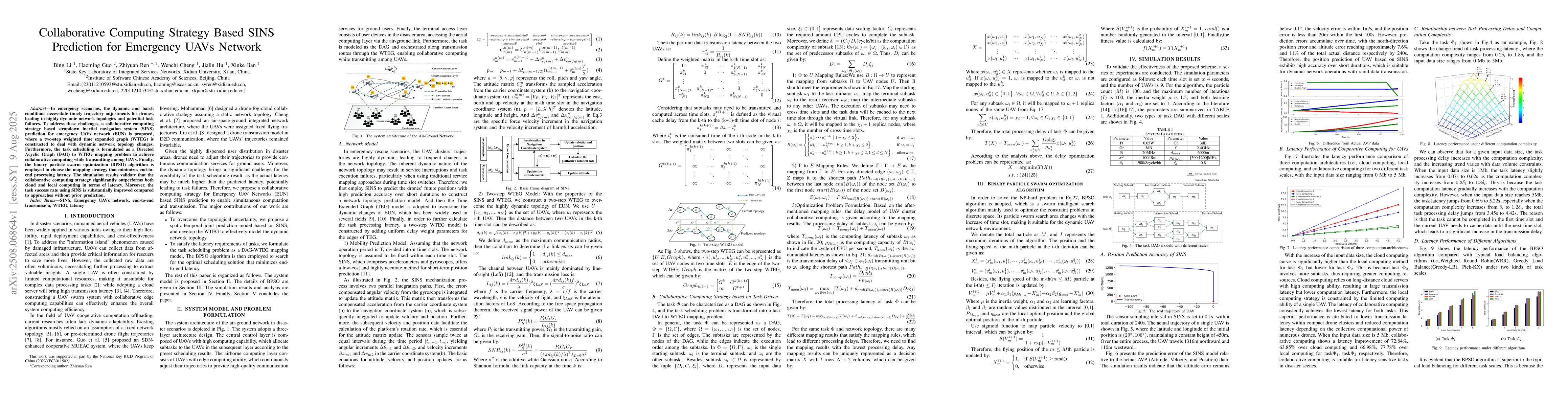 A collaborative computing strategy based on a strapdown inertial navigation system (SINS) prediction is proposed for emergency UAV networks, utilizing a two-step weighted time expanded graph (WTEG) to handle dynamic network topology changes and formulating task scheduling as a Directed Acyclic Graph (DAG) to WTEG mapping problem for collaborative computing while transmitting among UAVs. The binary particle swarm optimization (BPSO) algorithm is employed to minimize end-to-end processing latency.