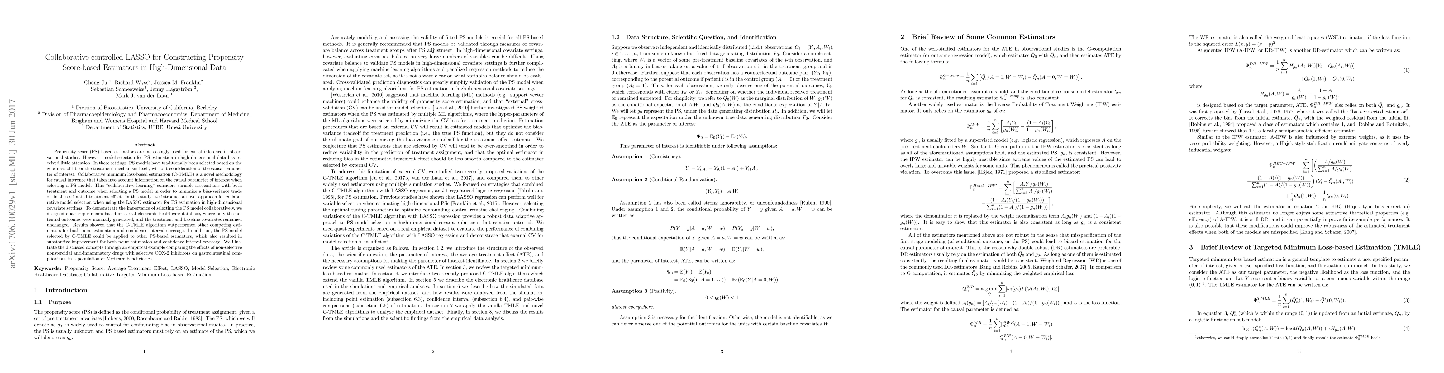 This paper introduces a collaborative-controlled LASSO method for constructing propensity score-based estimators in high-dimensional data, emphasizing the importance of considering causal parameters in model selection. The proposed C-TMLE algorithm outperforms other methods in both point estimation and confidence interval coverage, demonstrated through quasi-experiments and an empirical example on drug effects in Medicare beneficiaries.