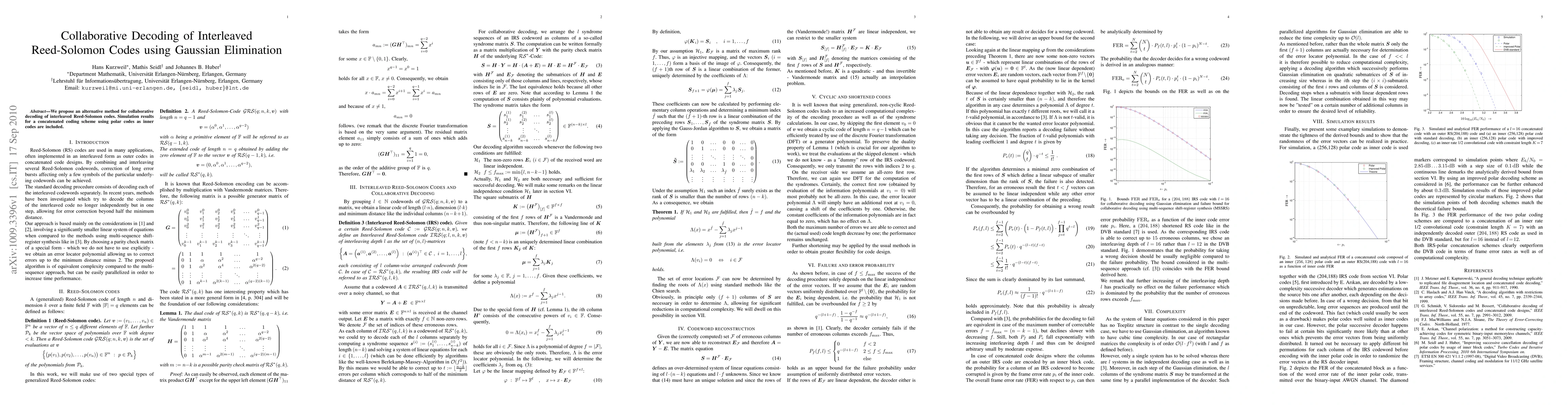 Summary: This paper introduces a novel collaborative decoding method for interleaved Reed-Solomon codes utilizing Gaussian elimination, and presents simulation results demonstrating its effectiveness in a concatenated coding scheme with polar codes as the inner layer.