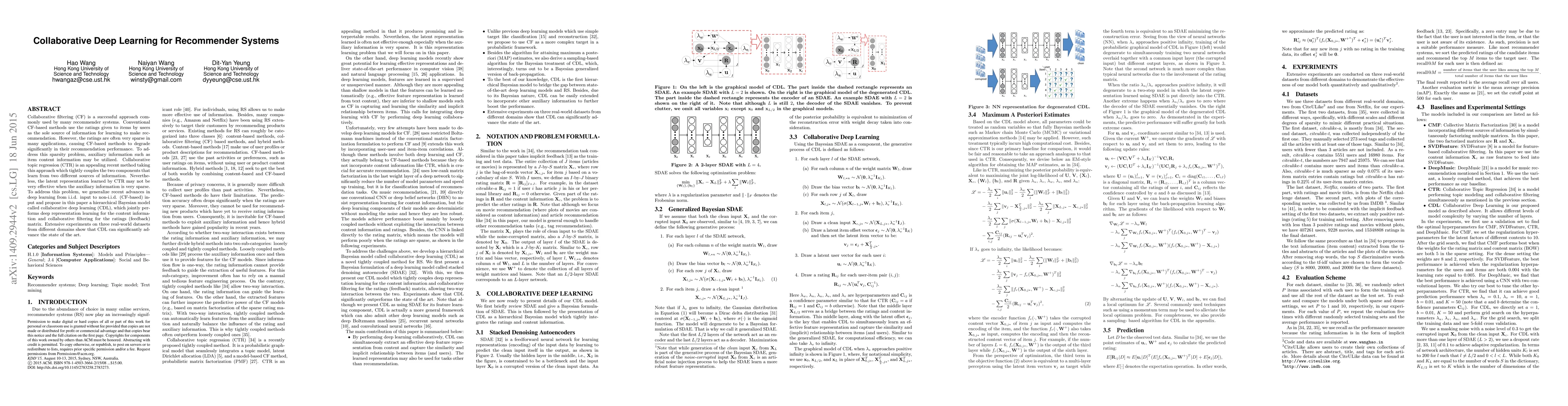 This paper proposes a collaborative deep learning (CDL) model to enhance recommender systems by integrating deep learning with collaborative filtering, addressing the sparsity issue in user ratings through the use of both ratings and auxiliary item content information. CDL achieves superior performance over existing methods, as demonstrated by experiments on three diverse datasets.