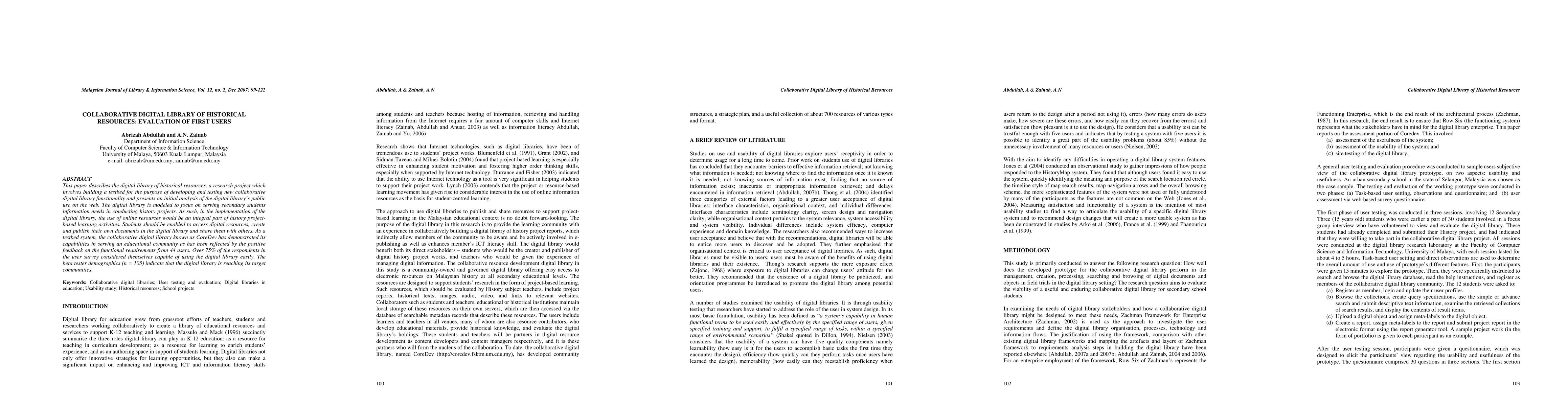 This research evaluates the first users of a collaborative digital library focused on historical resources, revealing positive feedback from 44 users regarding functionality and ease of use, with over 75% finding it accessible. The digital library, CoreDev, serves secondary students for history projects and is reaching its intended educational community.