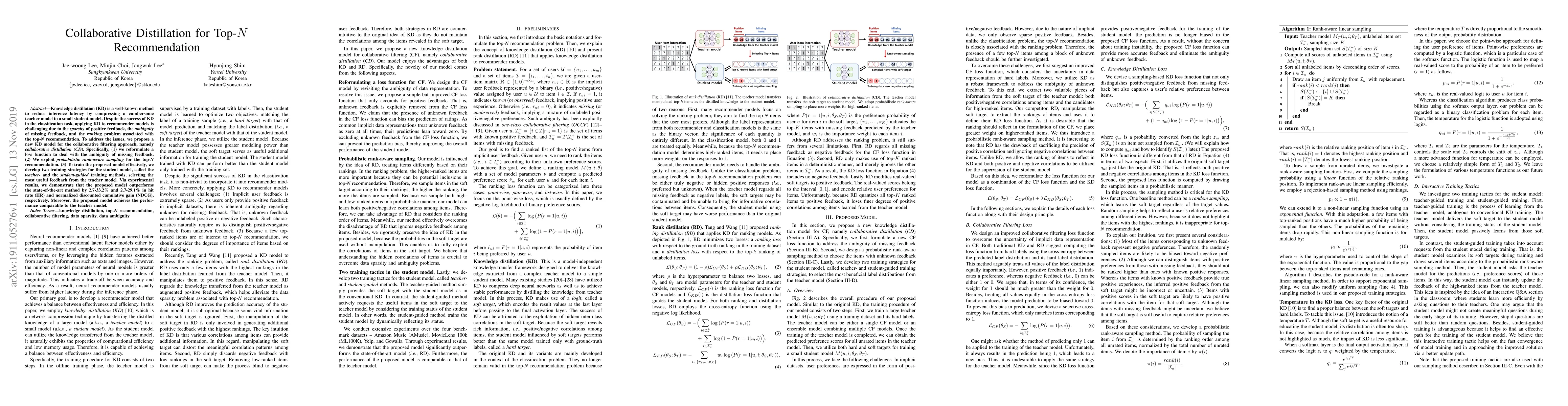 The paper proposes collaborative distillation for top-N recommendation, addressing the challenges of knowledge distillation in recommender systems through a reformulated loss function, probabilistic rank-aware sampling, and dual training strategies. The proposed model outperforms state-of-the-art methods in hit rate and NDCG while maintaining performance close to the teacher model.
