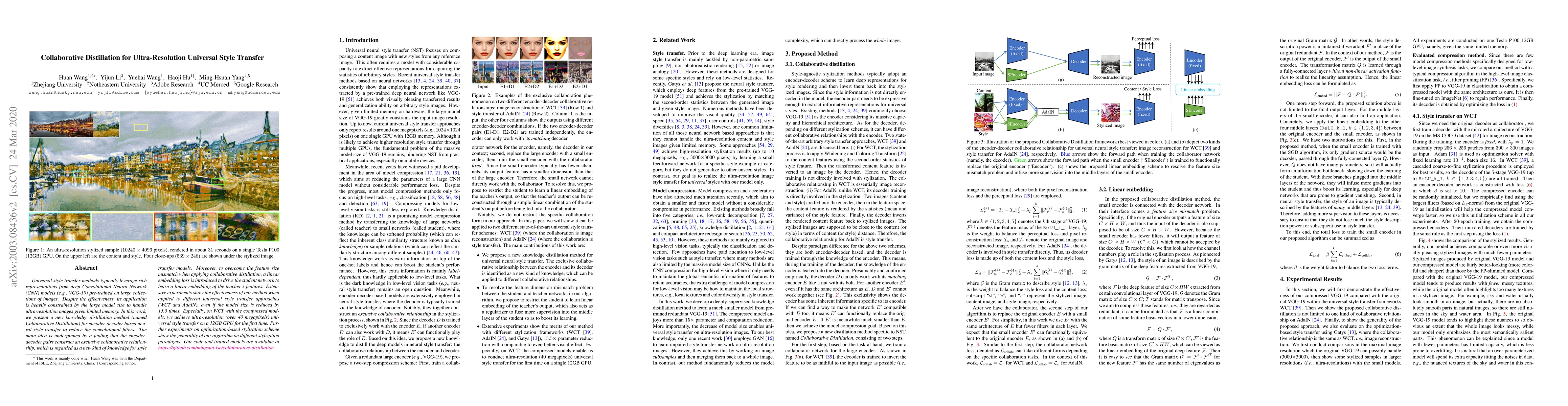 This paper introduces a Collaborative Distillation method to reduce the size of neural style transfer models while maintaining performance. By leveraging the collaborative relationship between encoder-decoder pairs, the method effectively compresses convolutional filters and achieves ultra-resolution style transfer on limited hardware.